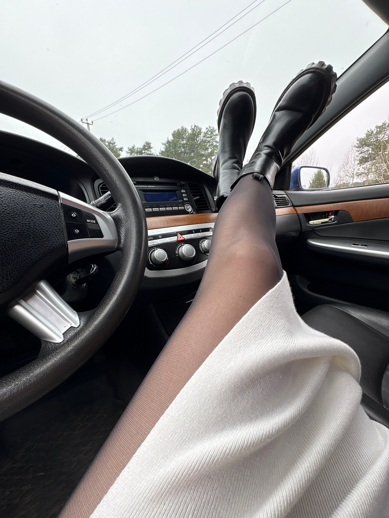The image depicts the interior of a car, with a steering wheel in the foreground. A woman's legs, clad in sheer black stockings and black boots, are resting on the dashboard or front window. The woman…read more