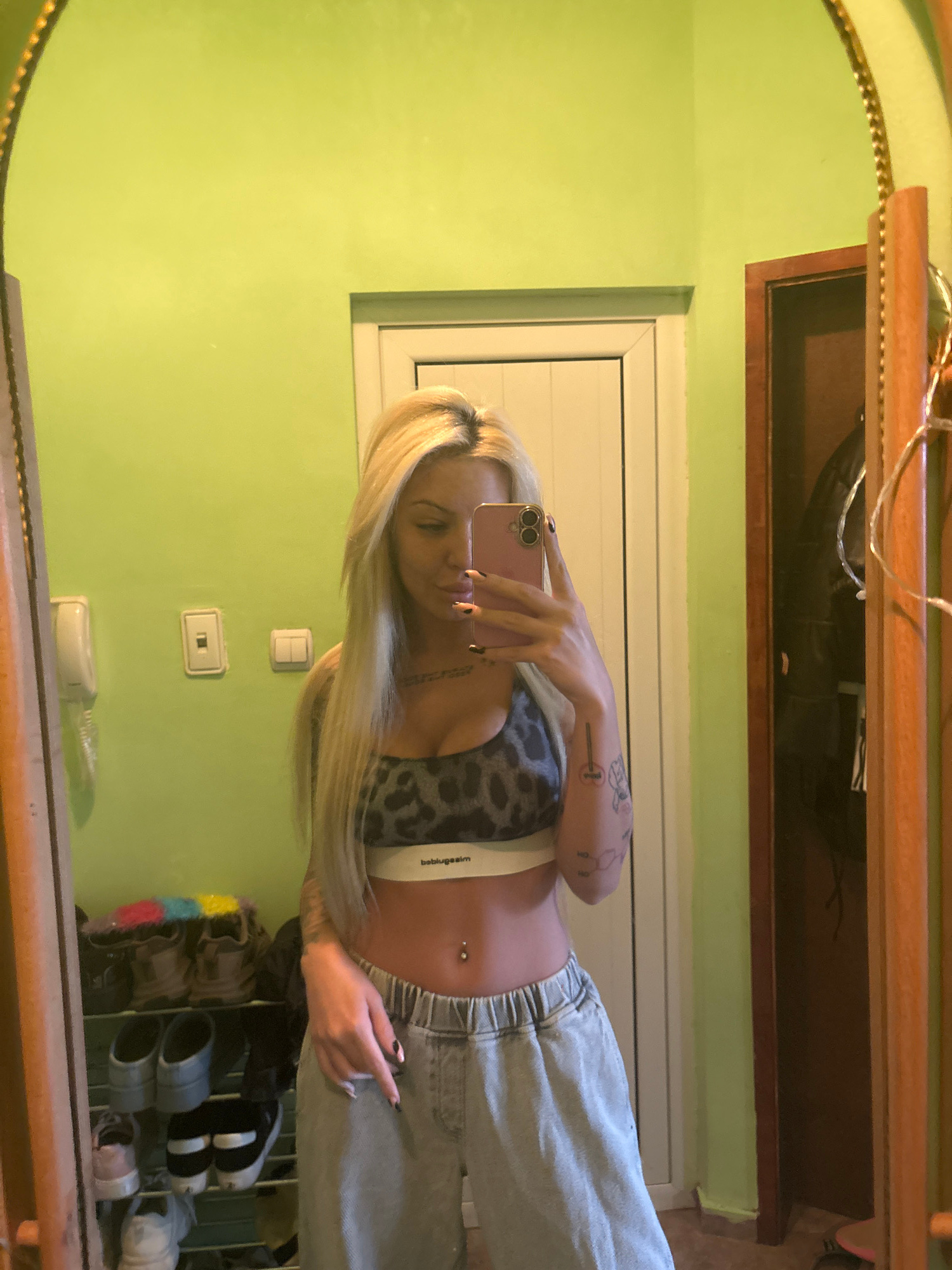 A woman is standing in an Unknown, Unknown location, taking a selfie in a mirror. The background wall is painted green and features a white light switch and a white wall socket. The woman has blonde h…read more