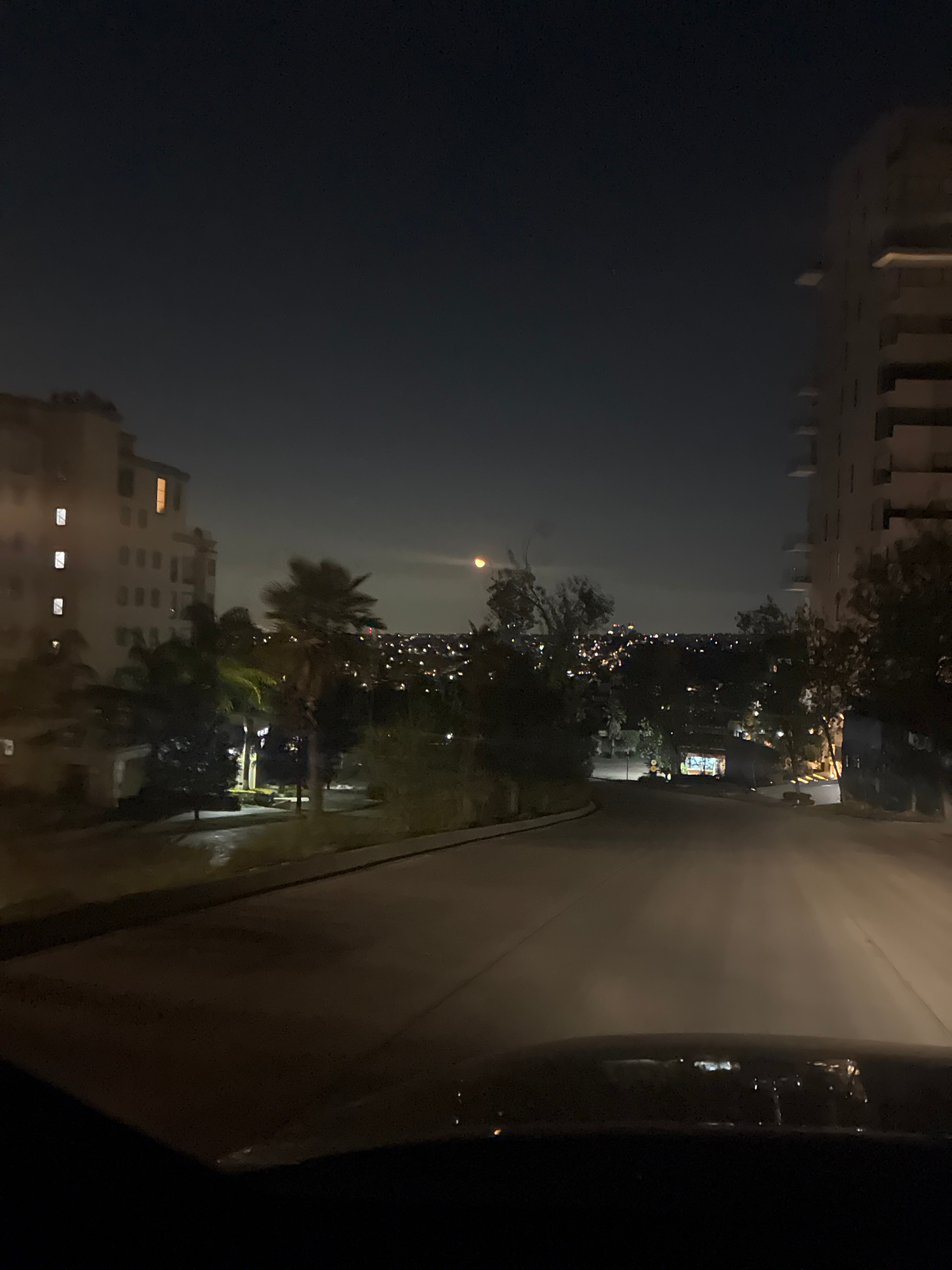 The image shows a nighttime urban scene in Huixquilucan de Degollado, Mexico, from the perspective of inside a vehicle. A road is visible, illuminated by streetlights, alongside a line of trees and ve…read more