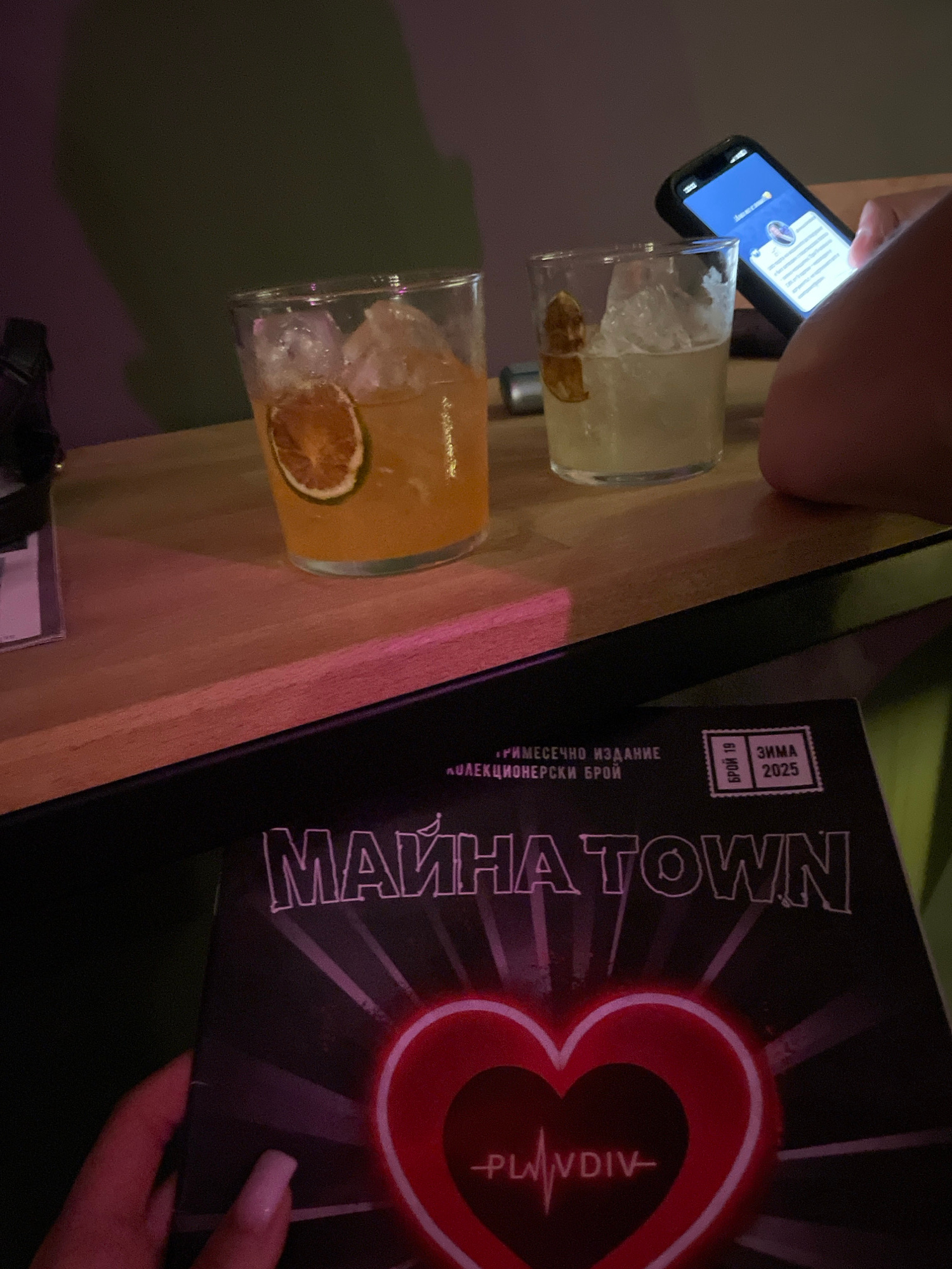 The image shows a table with two drinks and a magazine. The drinks are in clear glasses with ice and slices of citrus fruit. One drink is light in color, the other is darker. A person is holding a pho…read more