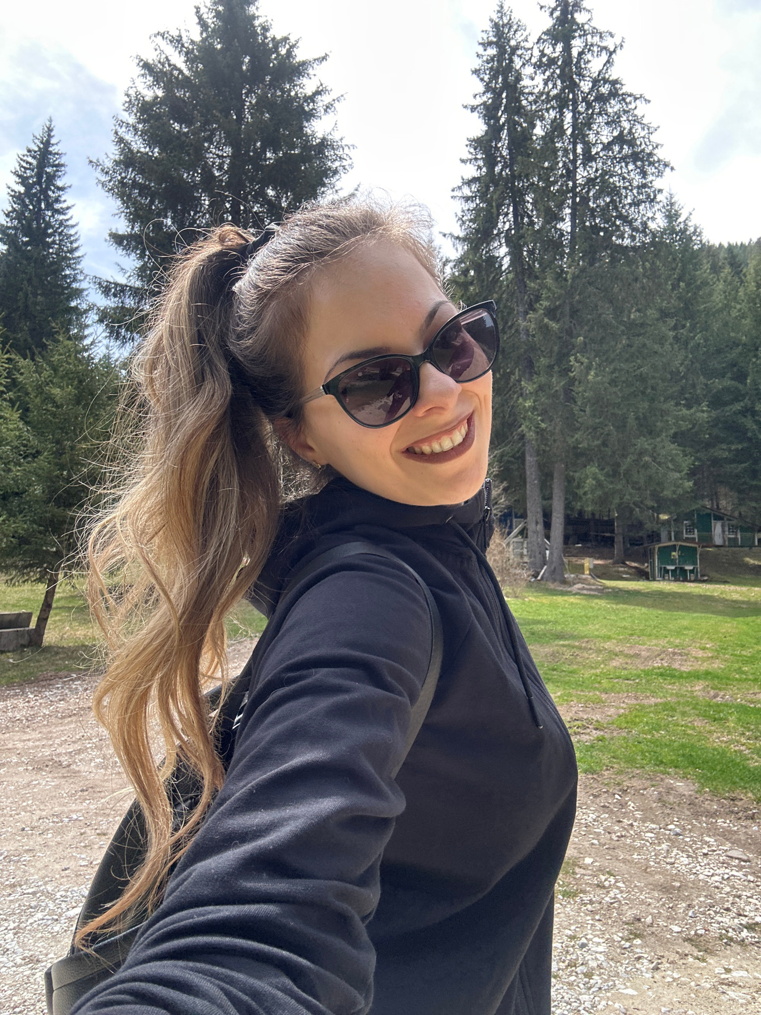 A woman is captured in a cheerful outdoor selfie, smiling broadly with her head tilted. She has long, wavy hair, light brown at the roots and fading to blonde at the ends, flowing over her shoulder. Sā¦read more
