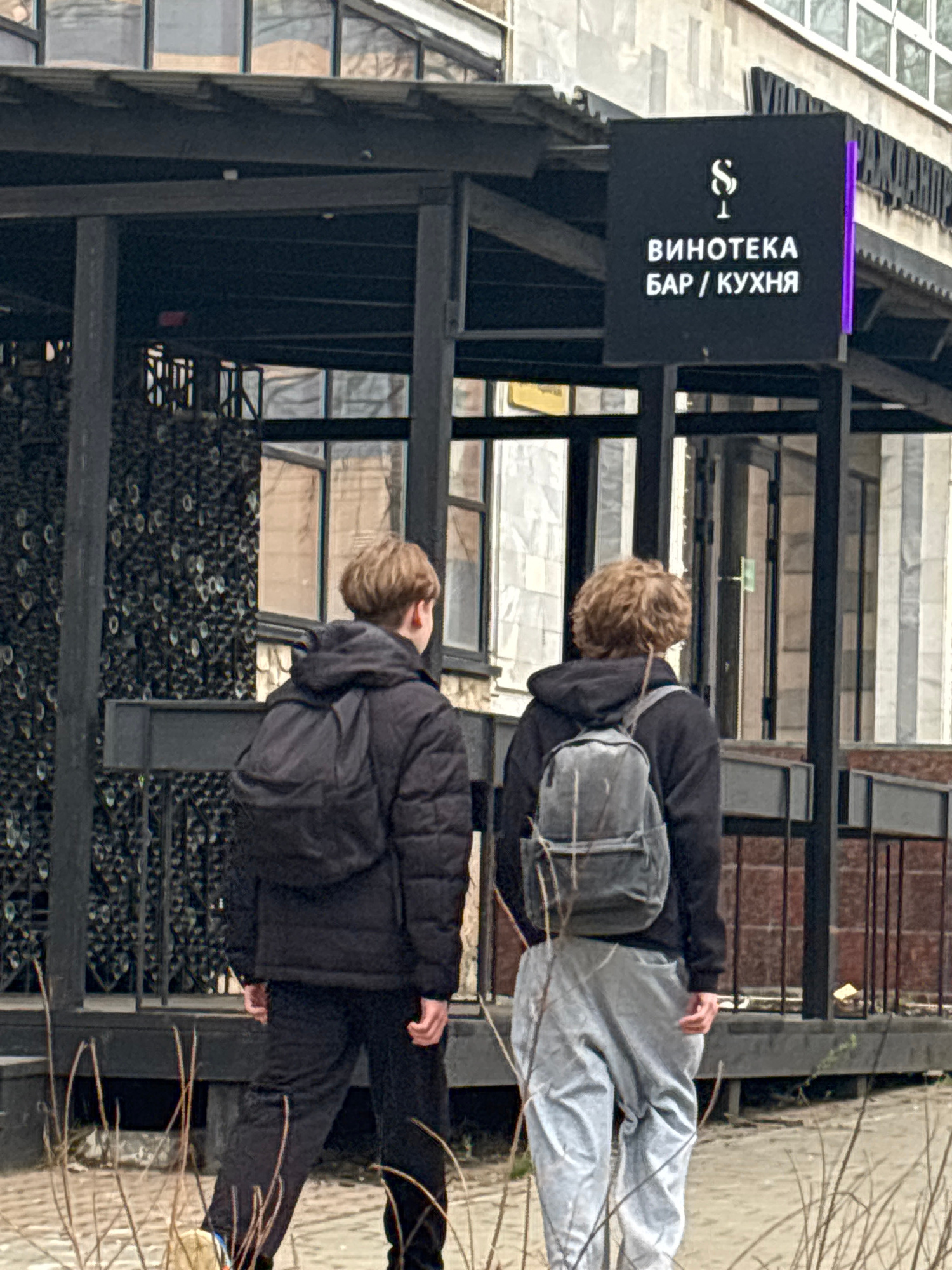 The image shows the exterior of a building with a sign in Russian that reads "Винтека Бар/ Кухня" (Vinoteka Bar/Kitchen), likely located in the city of Izhevsk, Russia. Two people are in the foregroun…read more
