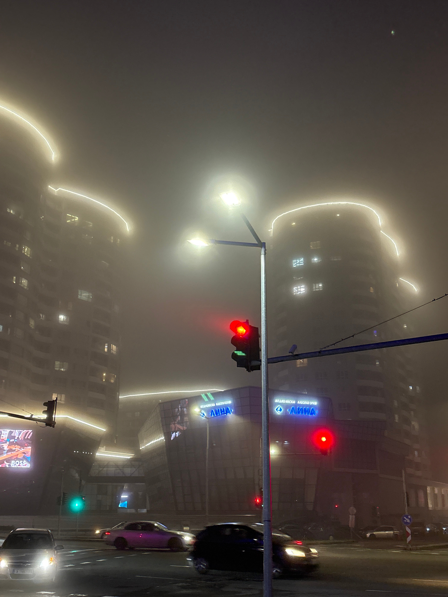 The photograph, likely taken at night, depicts a street scene in Burgas, Bulgaria, characterized by dense fog. Prominent buildings are visible but obscured by the fog. The buildings feature arched de…read more
