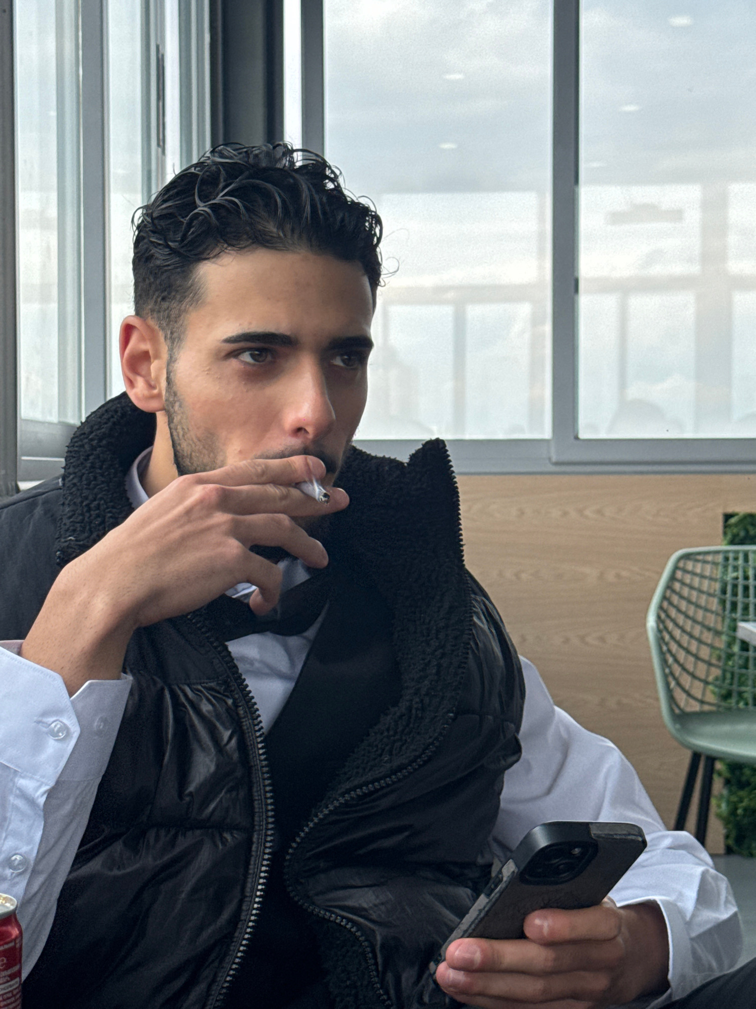 A medium shot shows a man in Sofia, Bulgaria, seated in a cafe next to a window. He is dark-haired with a short, neat beard. He wears a white collared shirt under a black puffer jacket. He holds a cig…read more
