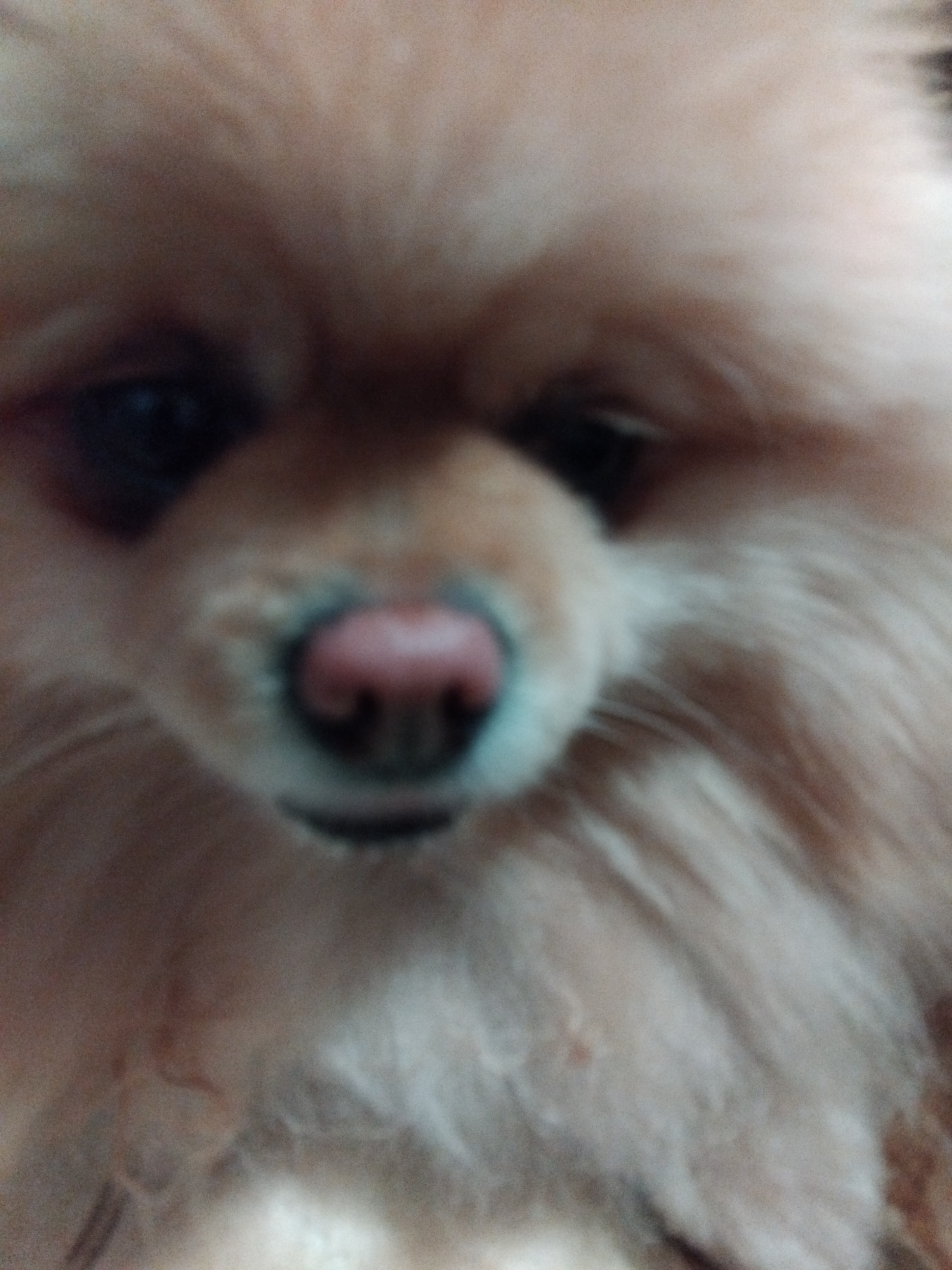 The image shows a blurry close-up of a dog's face. The dog has light brown or tan fur. Its nose is pink, and its eyes are dark. The background is out of focus and appears to be a beige or light brown…read more