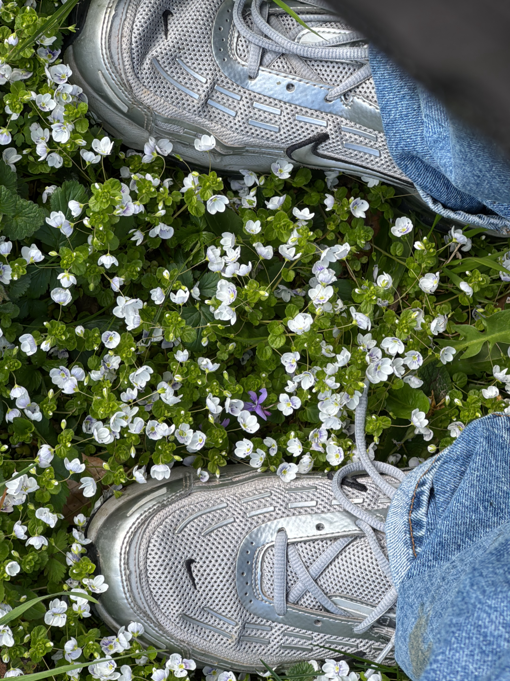 The image presents a top-down view of a person's lower legs and feet resting on a patch of flowering ground in Erba, Italy. Two light silver/grey athletic sneakers, characterized by mesh uppers, metalβ¦read more
