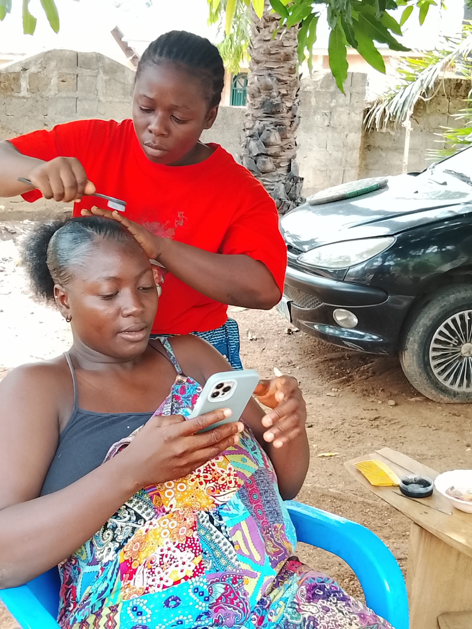 In Akwanga, Nigeria, a woman in a red shirt combs the hair of another woman seated in a blue plastic chair. The seated woman is looking at a mobile phone in her hands. A black car is parked in the background near a palm tree. A small wooden table is beside the seated woman, holding a comb, a small container, and a bowl. The setting appears to be outdoors, with a building visible in the background. | Open Wire