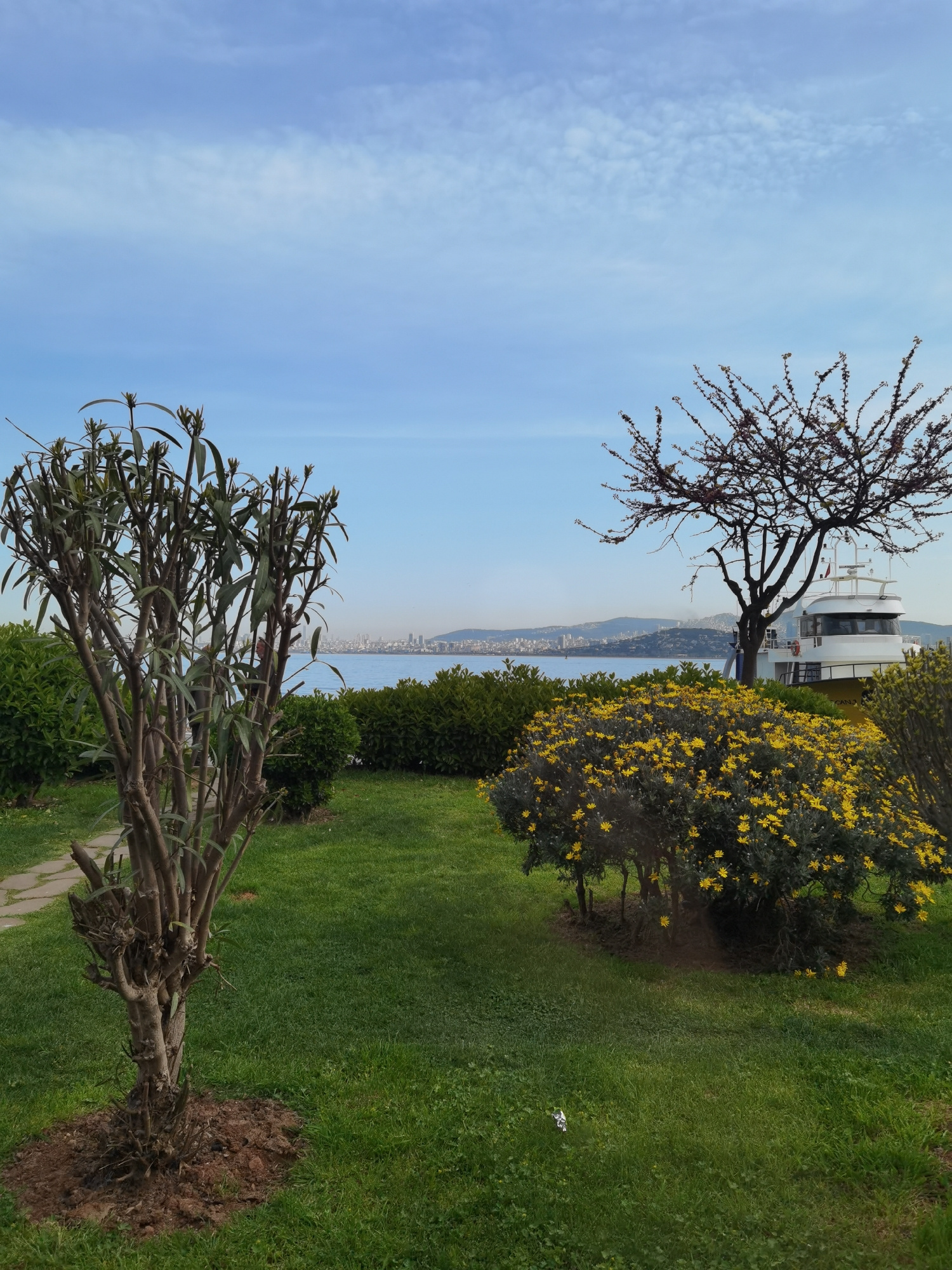 The image depicts a serene outdoor scene in the Prince Islands, Turkey. In the foreground, a well-maintained lawn is punctuated by shrubs and trees. A unique tree with sparse foliage stands to the lef…read more