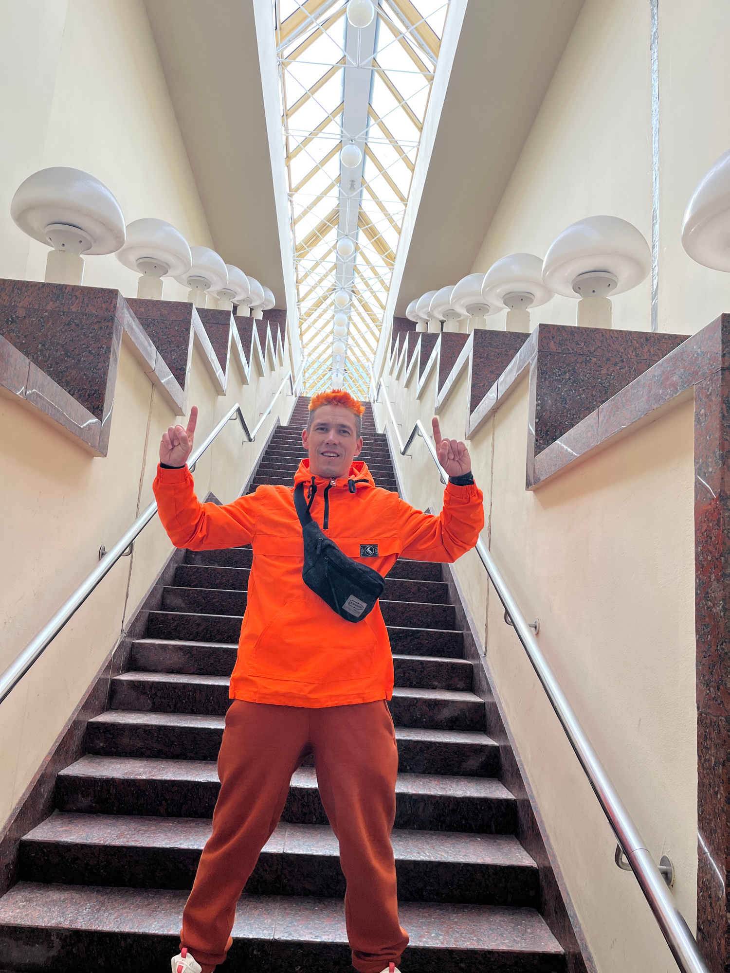 A man stands on a staircase in a building. The man has orange hair and is wearing an orange jacket, brown pants, white sneakers, and a black bag. He is pointing his fingers at the camera. The staircas…read more