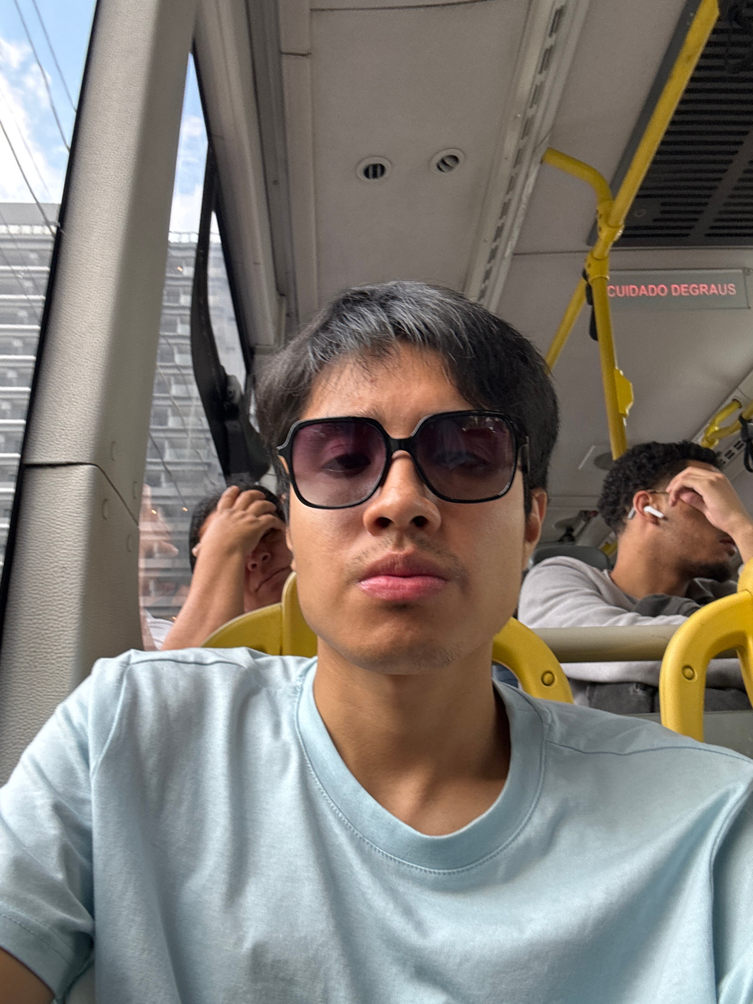 The image depicts an individual wearing sunglasses and a light blue t-shirt on what appears to be public transportation. Other individuals are visible in the background, including one with an earpiece…read more