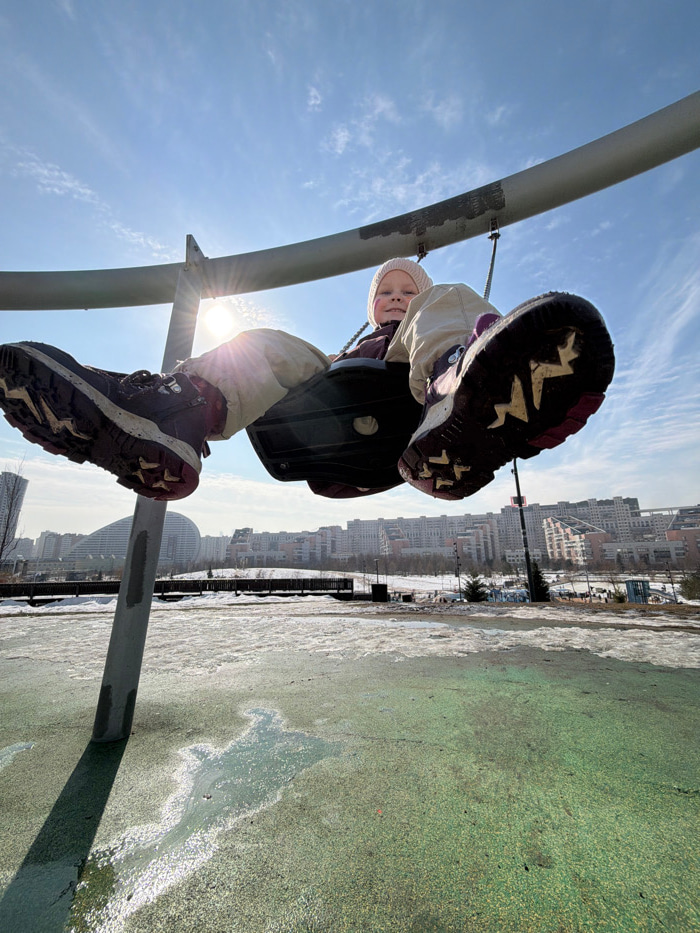 A low-angle photograph captures a young child seated in a swing within a playground, set against a bright, clear blue sky. The child, appearing to be a girl, wears a light pink knit beanie, light-colo…read more