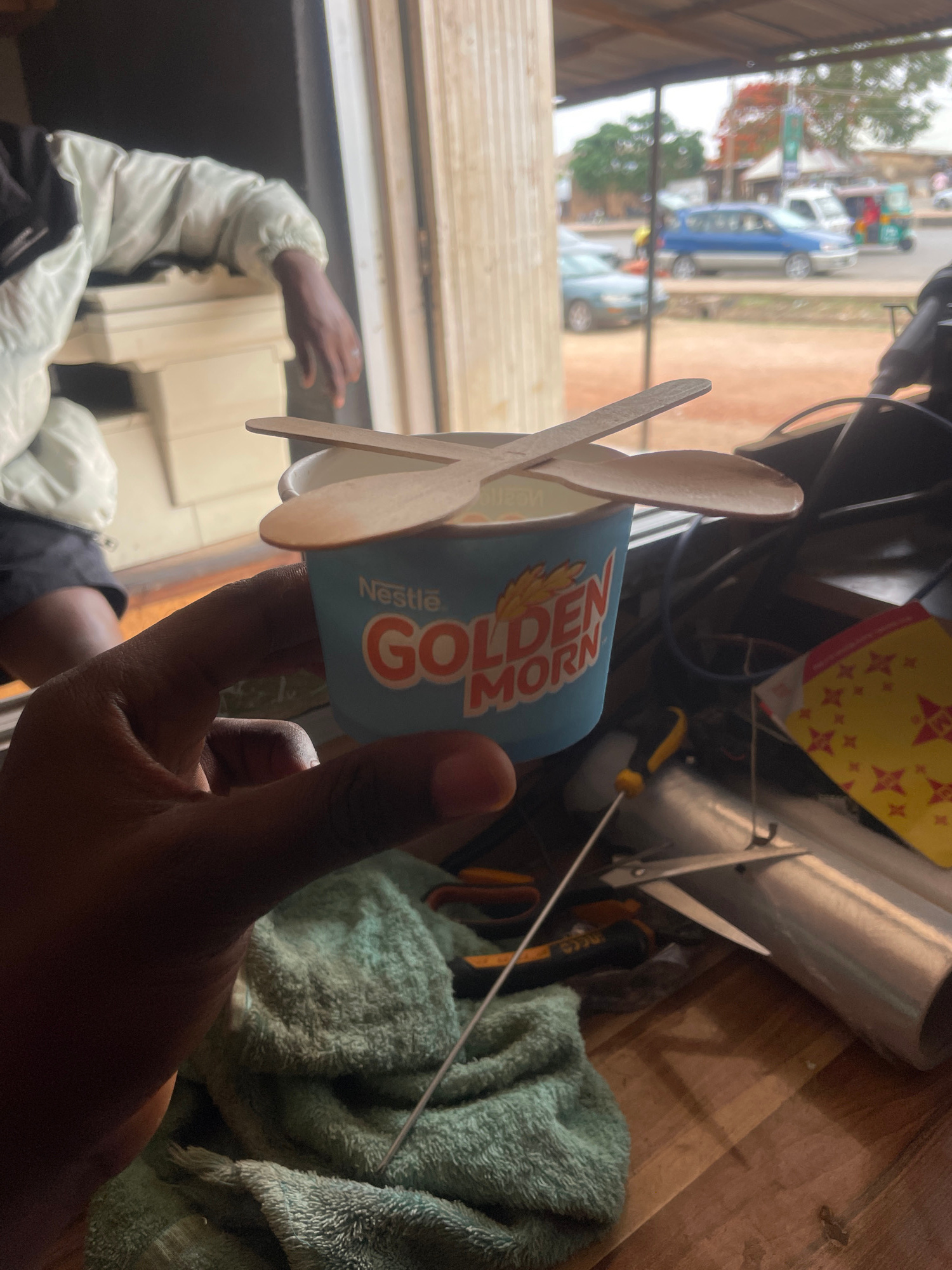 An individual holds a Nestlé Golden Morn instant cereal paper cup with two wooden spoons stuck into the cereal within the cup. The location is Jos, Nigeria. In the background, blurred elements include…read more