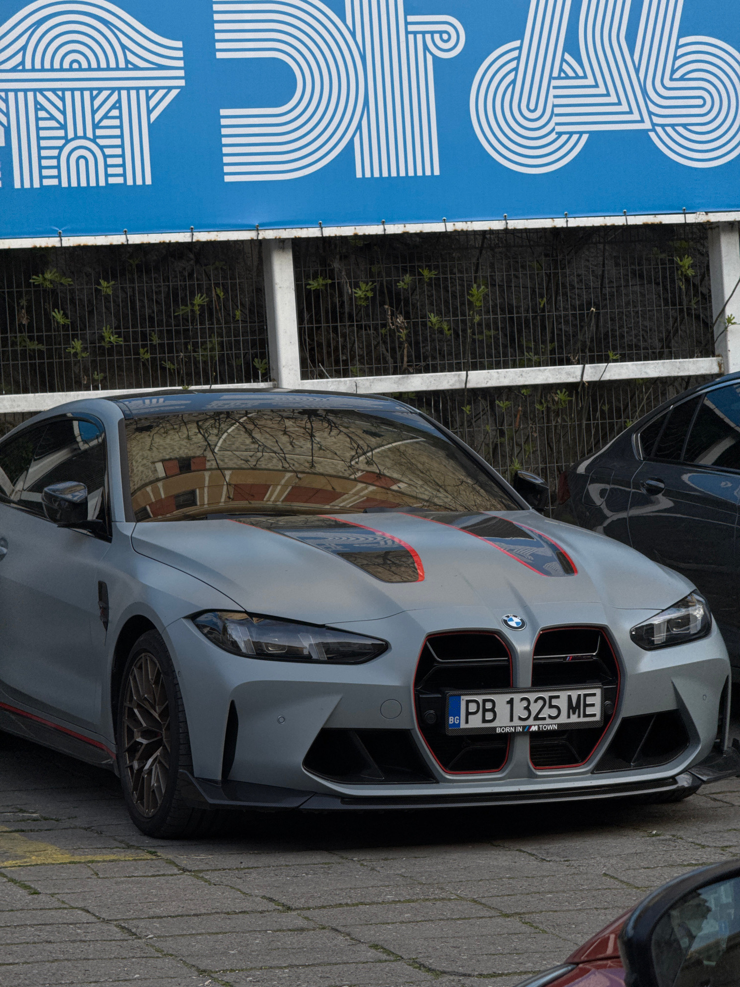 A gray BMW car, bearing the Bulgarian license plate "PB 1325 ME" and the inscription "BORN IN MTOWN," is parked on a brick-paved surface. A blue banner featuring a white geometric design hangs to the…read more