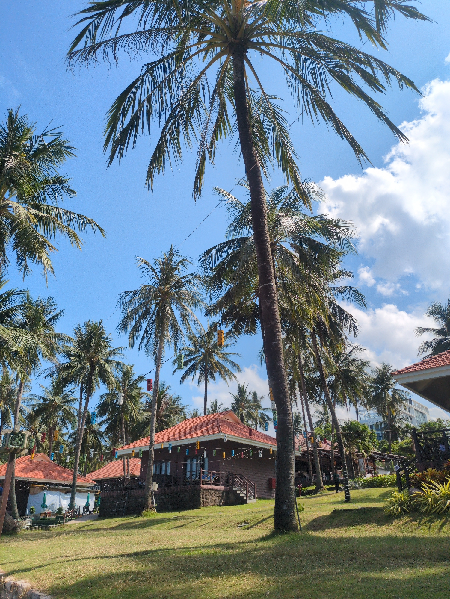 Captured from a low-angle perspective, the image showcases a tropical scene dominated by palm trees against a backdrop of a bright blue sky dotted with fluffy white clouds. The location is Phú Quốc, V…read more