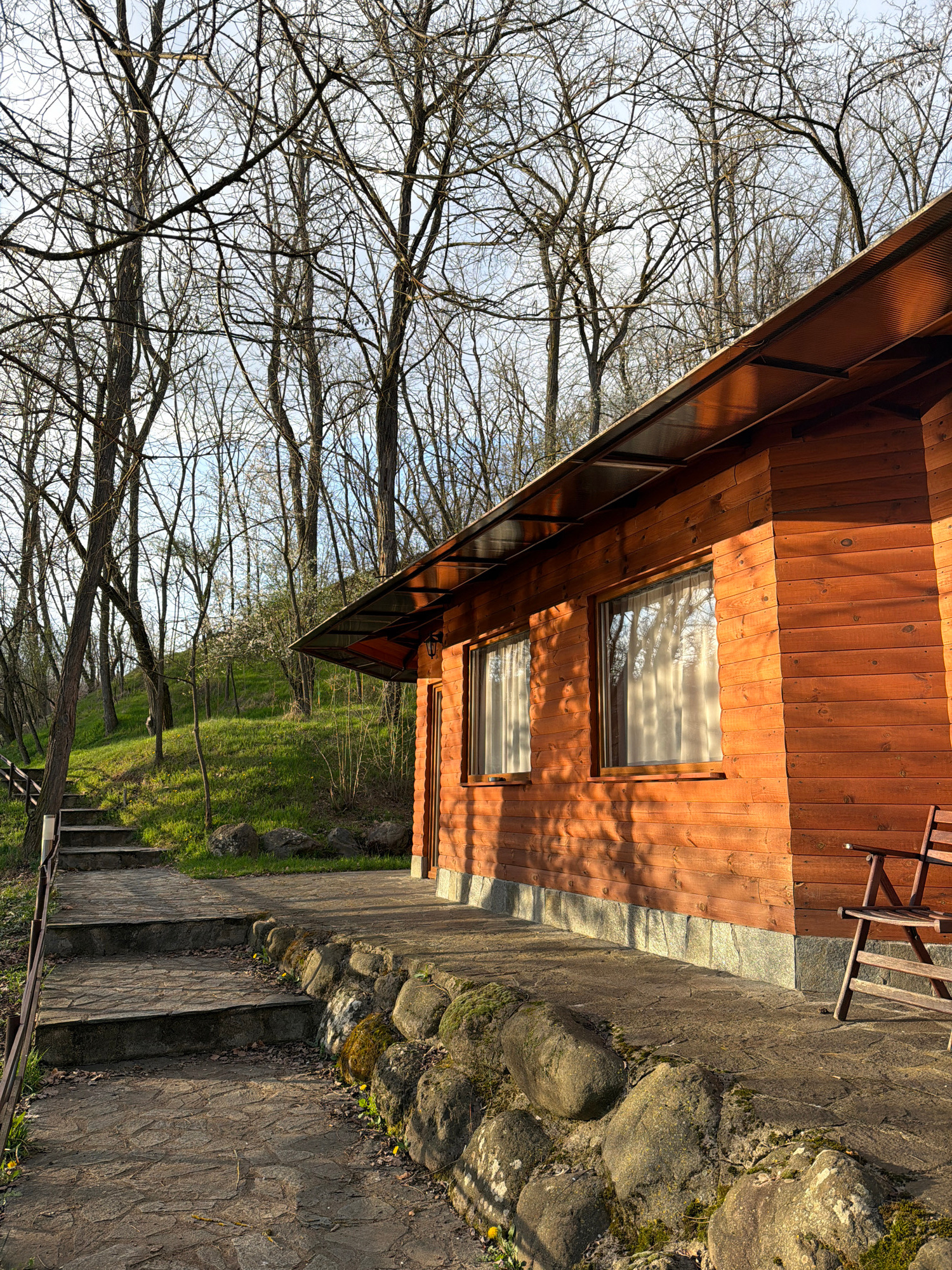 The scene depicts a brown wooden building in Ginovci, North Macedonia, adjacent to a stone pathway with moss-covered rocks. Leafless trees are visible in the background, indicating a possible season o…read more