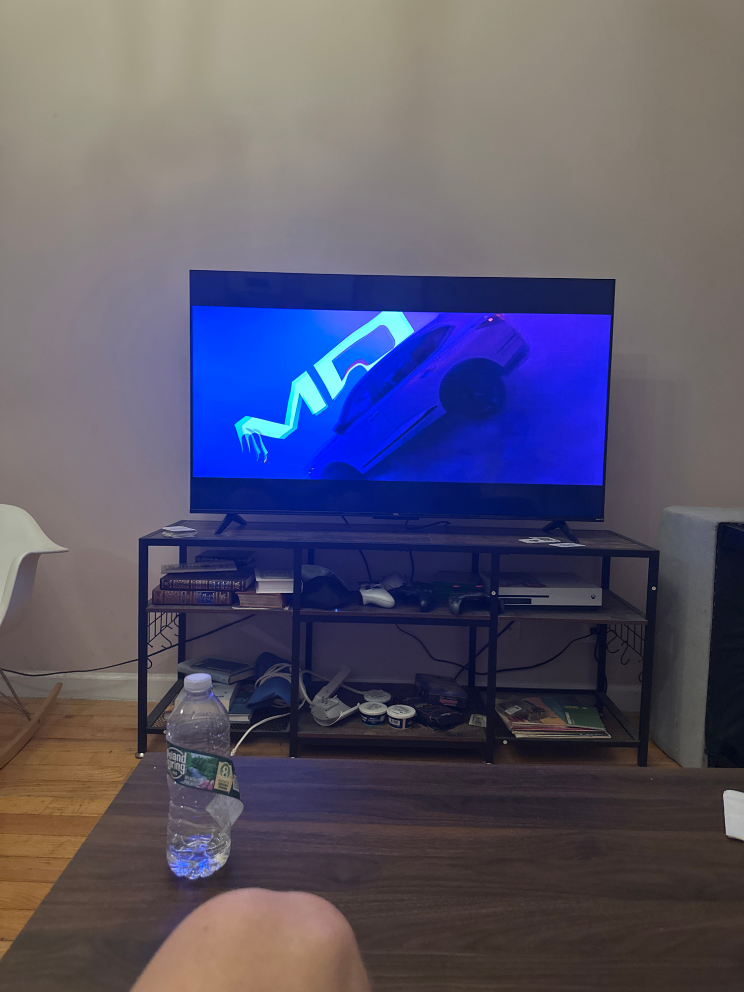 A television is mounted on a wall beside a black metal shelving unit containing an Xbox, video game controllers, and other items. A plastic water bottle is on the table in front of the shelf. A white…read more