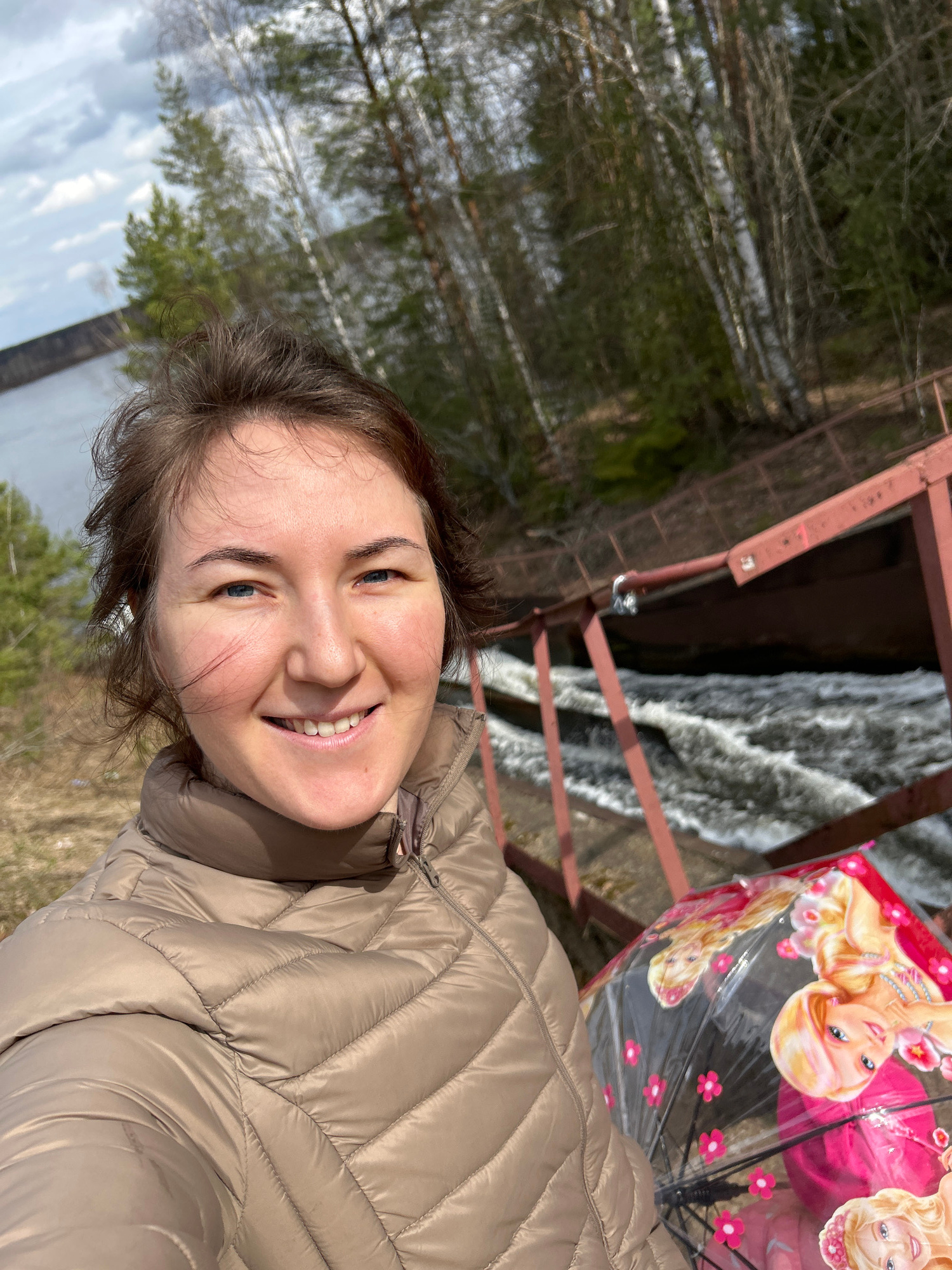 A woman smiles at the camera in a selfie. She wears a beige puffer jacket. Behind her is a rushing waterfall, visible through a red metal railing. An umbrella with a cartoon character design is partia…read more