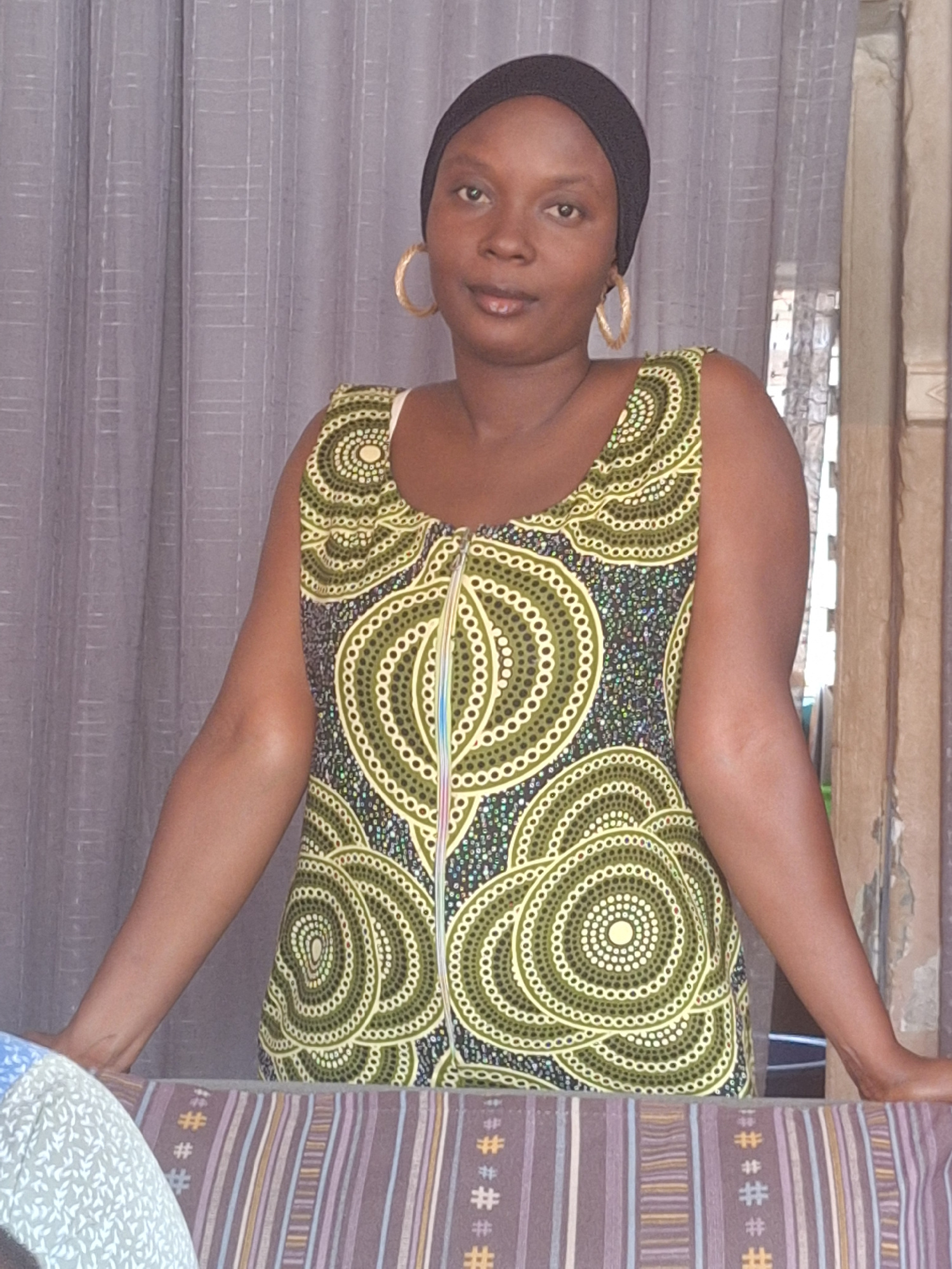 A woman is indoors, posing for a photograph. She is wearing a dress with a green, black, and white circular pattern and large gold hoop earrings. She also has a black head covering. The background inc…read more