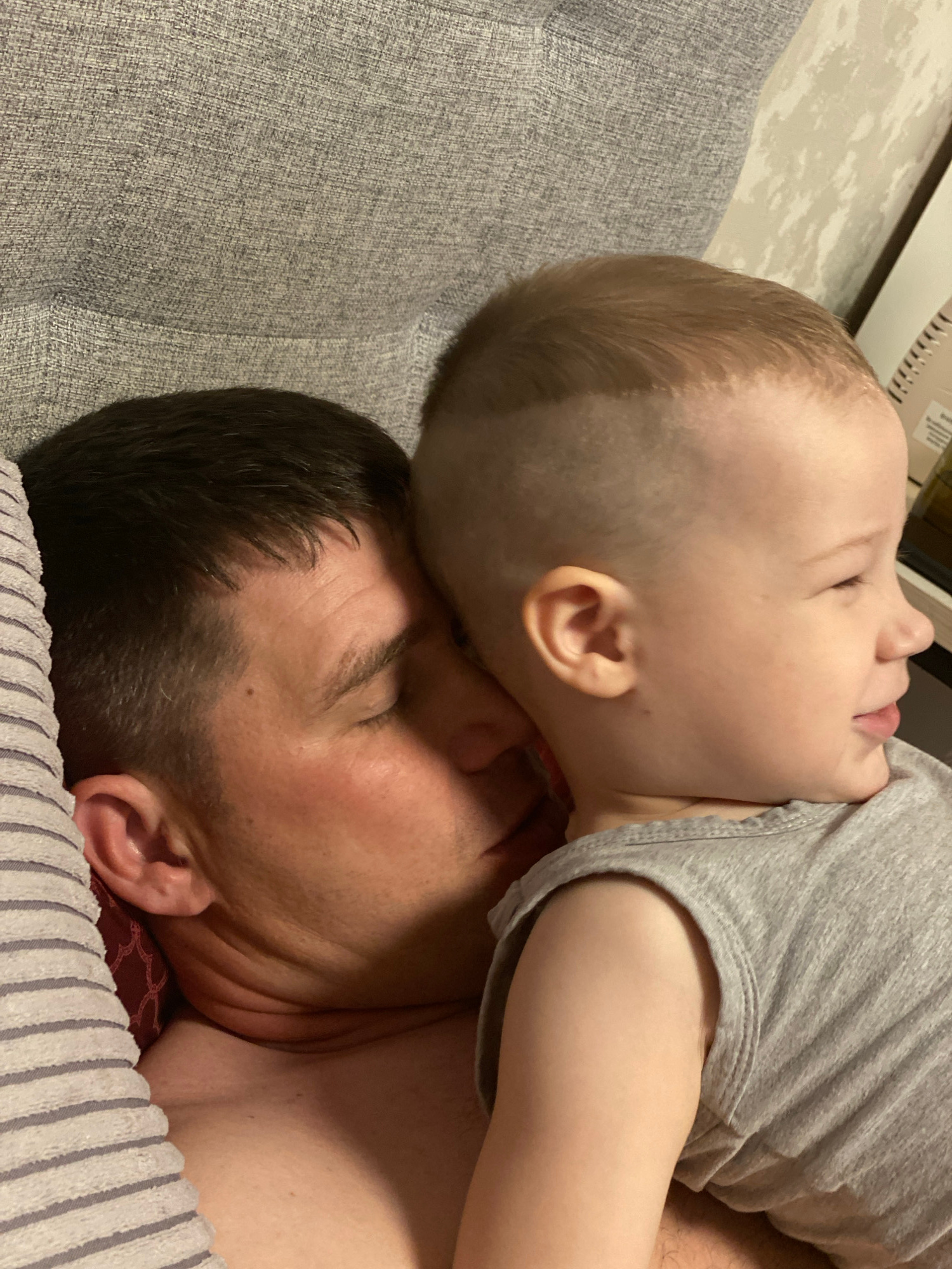 A man and a young child are depicted in a close-up, intimate moment. The man is lying on his back, his head resting on a pillow with a striped pattern. The child is lying on top of the man, with the cā¦read more