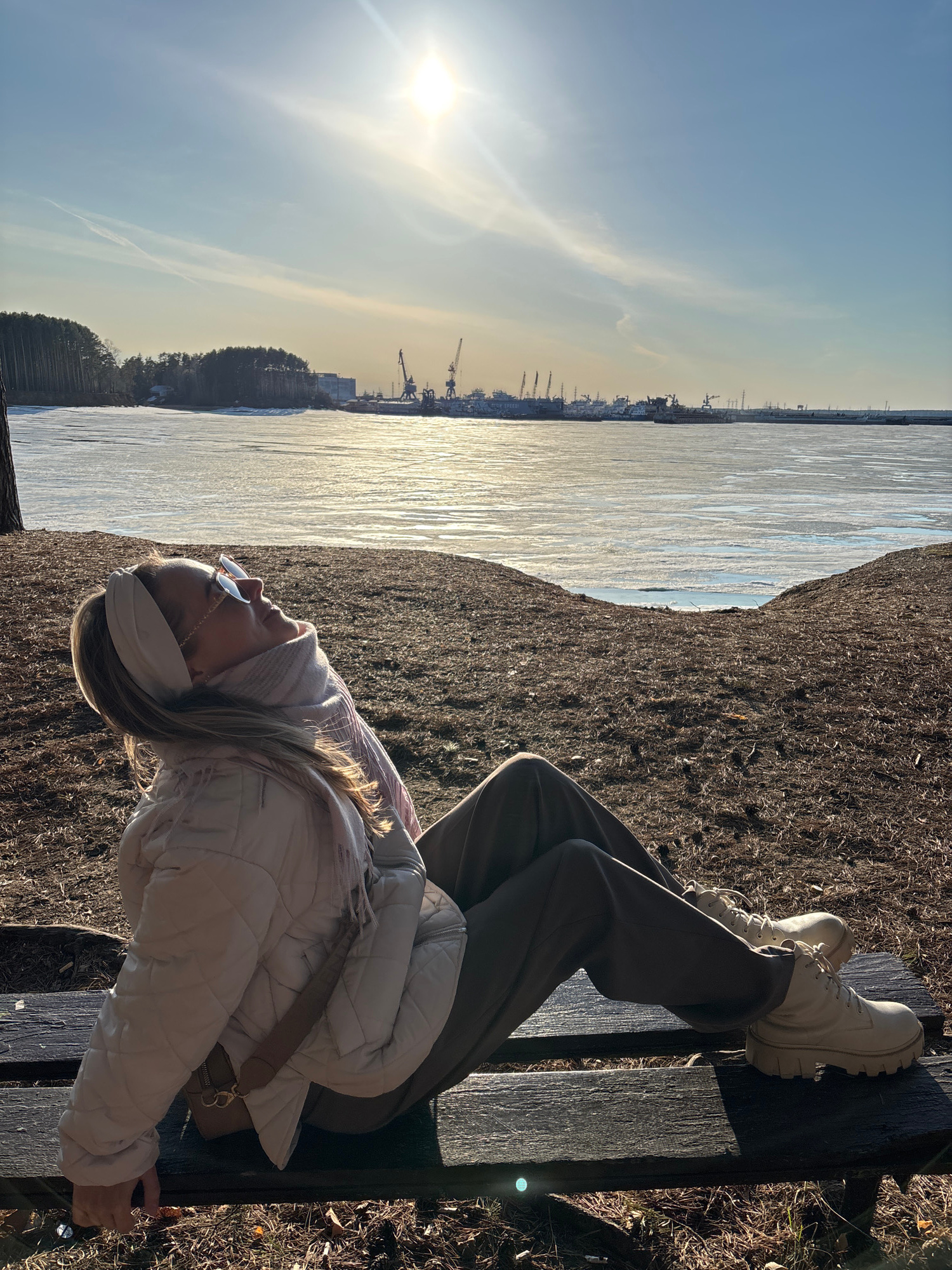A photograph shows a young woman reclining on a bench, her feet pointing towards the top right of the frame. She is wearing a white quilted jacket, brown trousers, and off-white platform boots. Her hair is blonde, and she has sunglasses perched on her face. A bag with a brown strap rests on her torso. The background reveals a body of water, likely the Kama River, with a cityscape visible in the distance, suggesting the city of Chaikovsky, Russia. The sky is pale blue, with the sun casting a bright glare. The bench sits on a grassy or dirt patch. | Open Wire