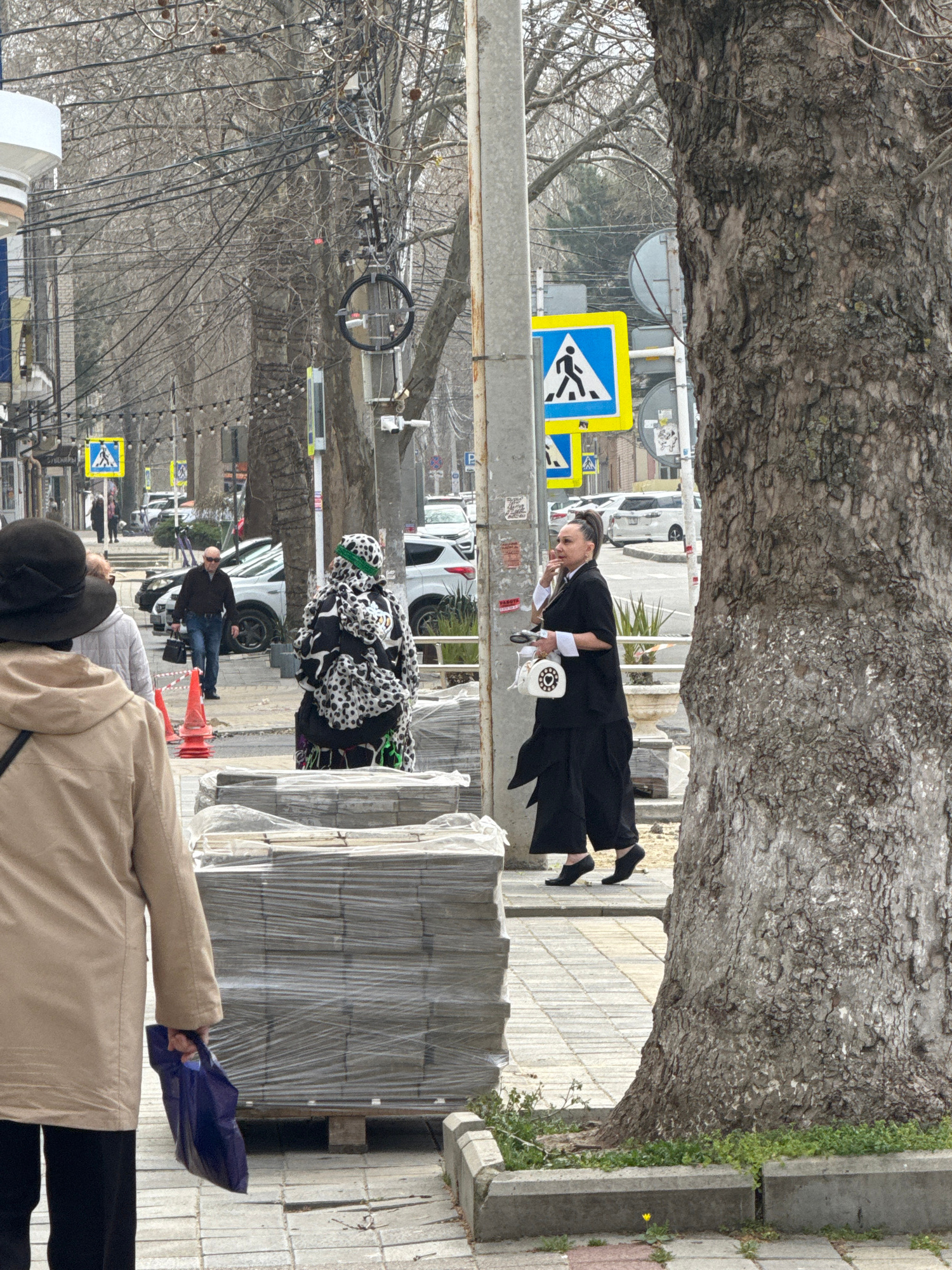 The image captures a daytime urban street scene in Anapa, Russia, depicting a sidewalk alongside a road. In the immediate foreground, a person with their back to the viewer wears a tan trench coat, b…read more