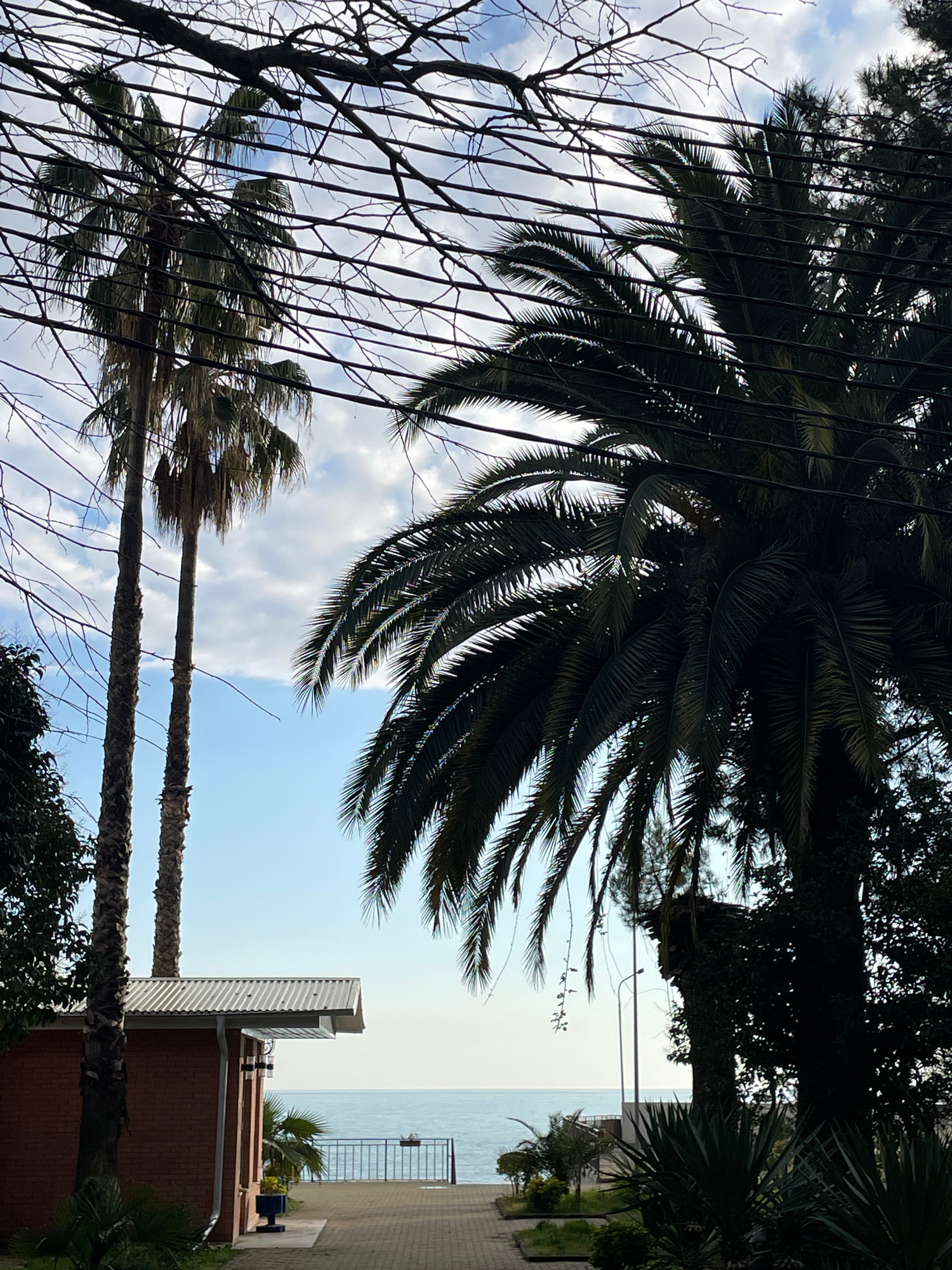 The image depicts a scene in Gagra, Abkhazia, oriented at an unusual angle. Two tall palm trees are visible in the foreground against a backdrop of a blue sky with scattered clouds. A building with a…read more