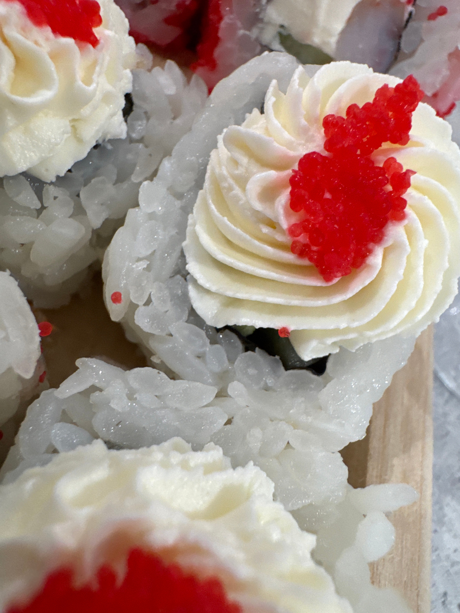 A close-up shot of several sushi rolls arranged in a wooden tray. The sushi rolls are primarily white rice with a swirl of white cream cheese on top. The cream cheese is decorated with red roe. The sc…read more