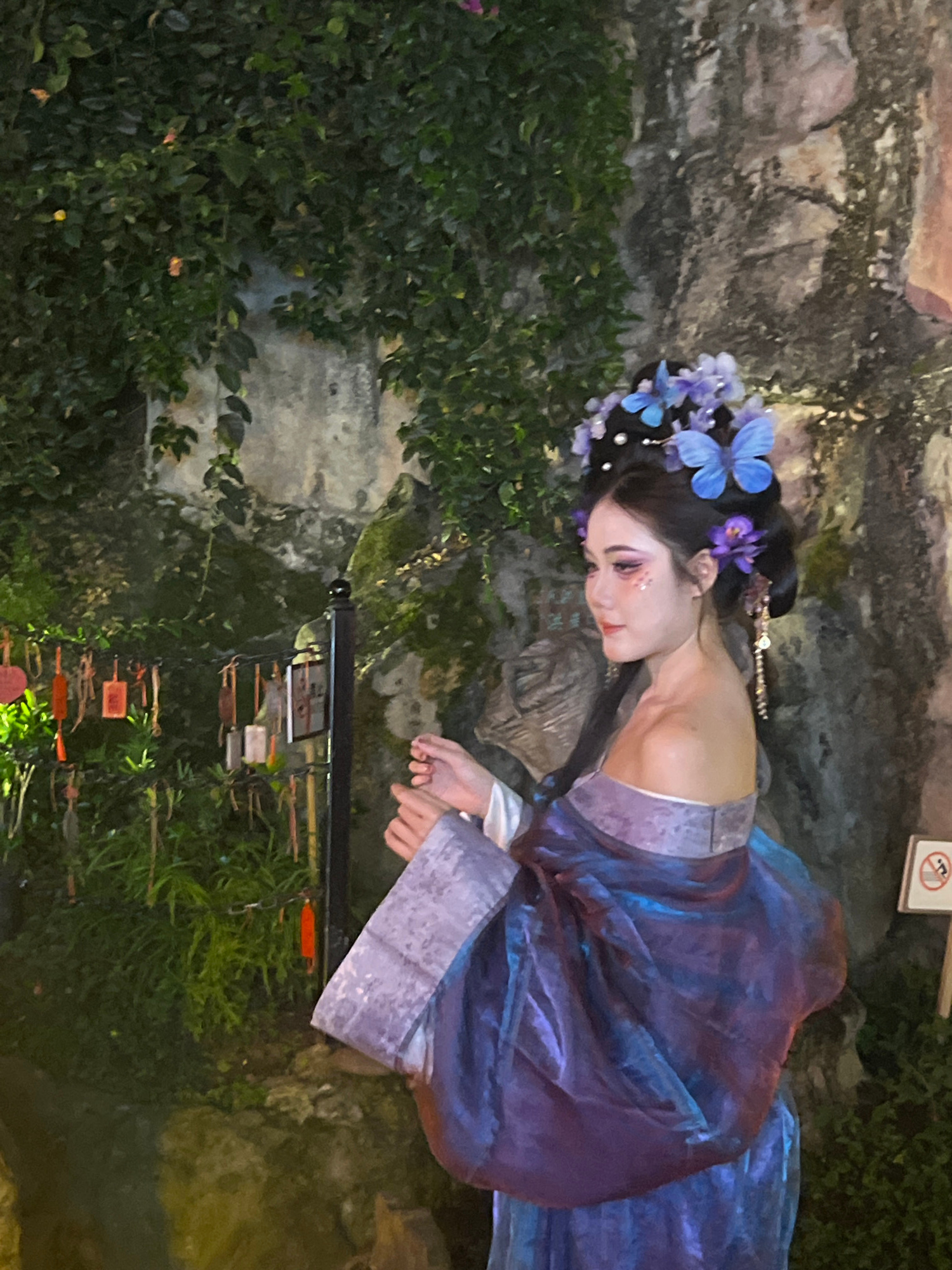 A woman in a traditional Chinese dress lies on a rock surface in a garden setting. She wears a dark wig adorned with blue and purple flowers and has delicate makeup on her face. Her dress is predomina…read more