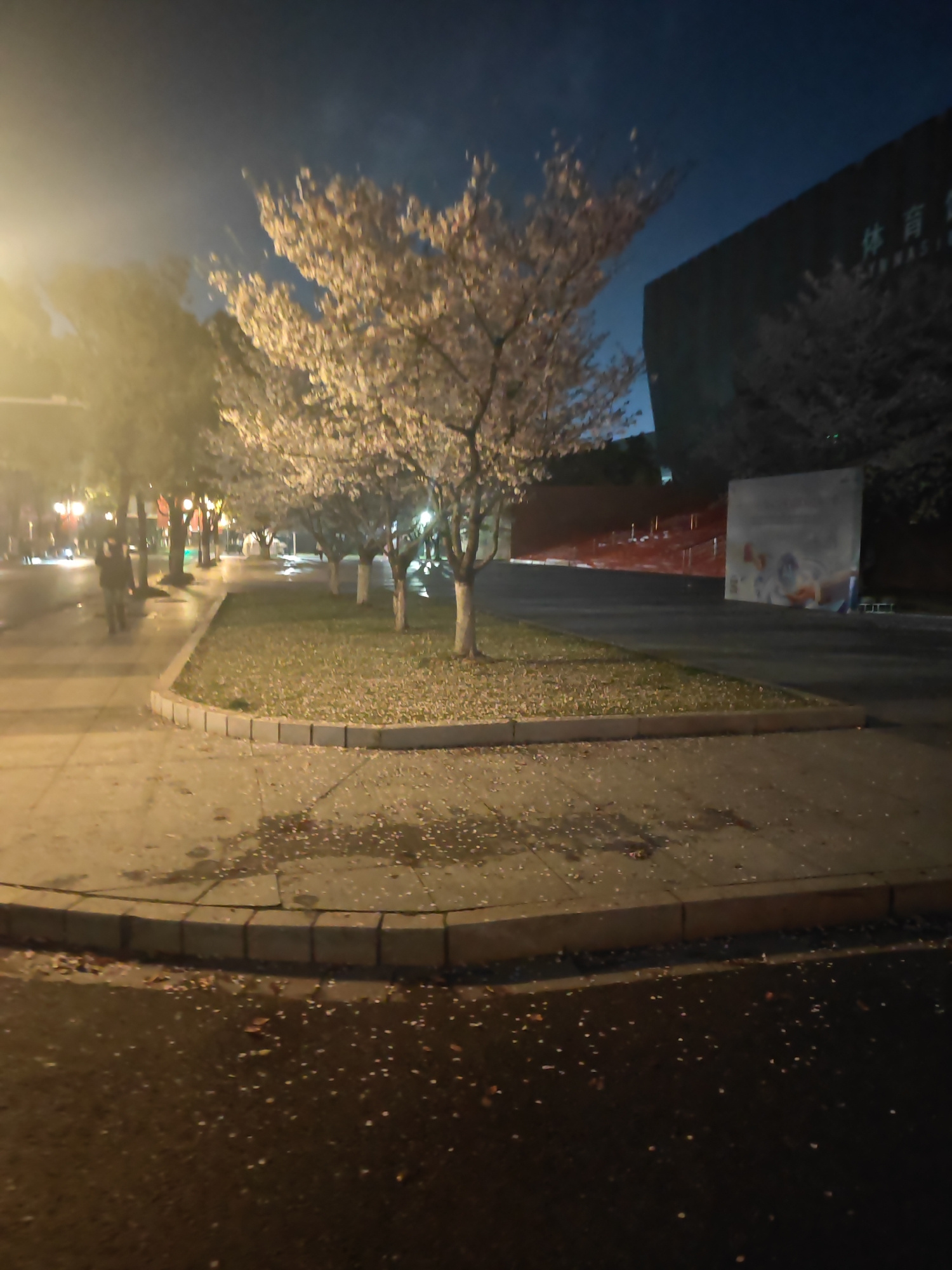 The image depicts a street scene at night, likely in the Jiangning District of China. The environment is illuminated by streetlights, casting a warm glow. A sidewalk bordered by a low, rectangular cur…read more