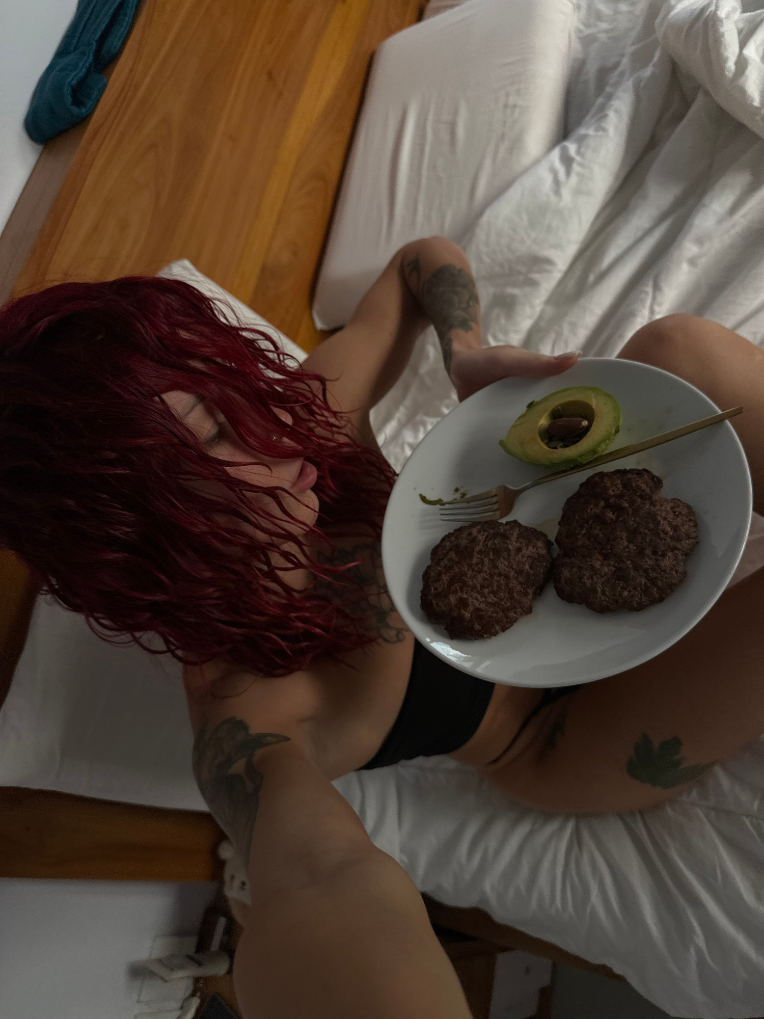 The image is taken in an interior location. A person with red hair is holding a plate with two cooked meat patties and a halved avocado with a fork, while lying on a bed. The bed has white sheets. The…read more