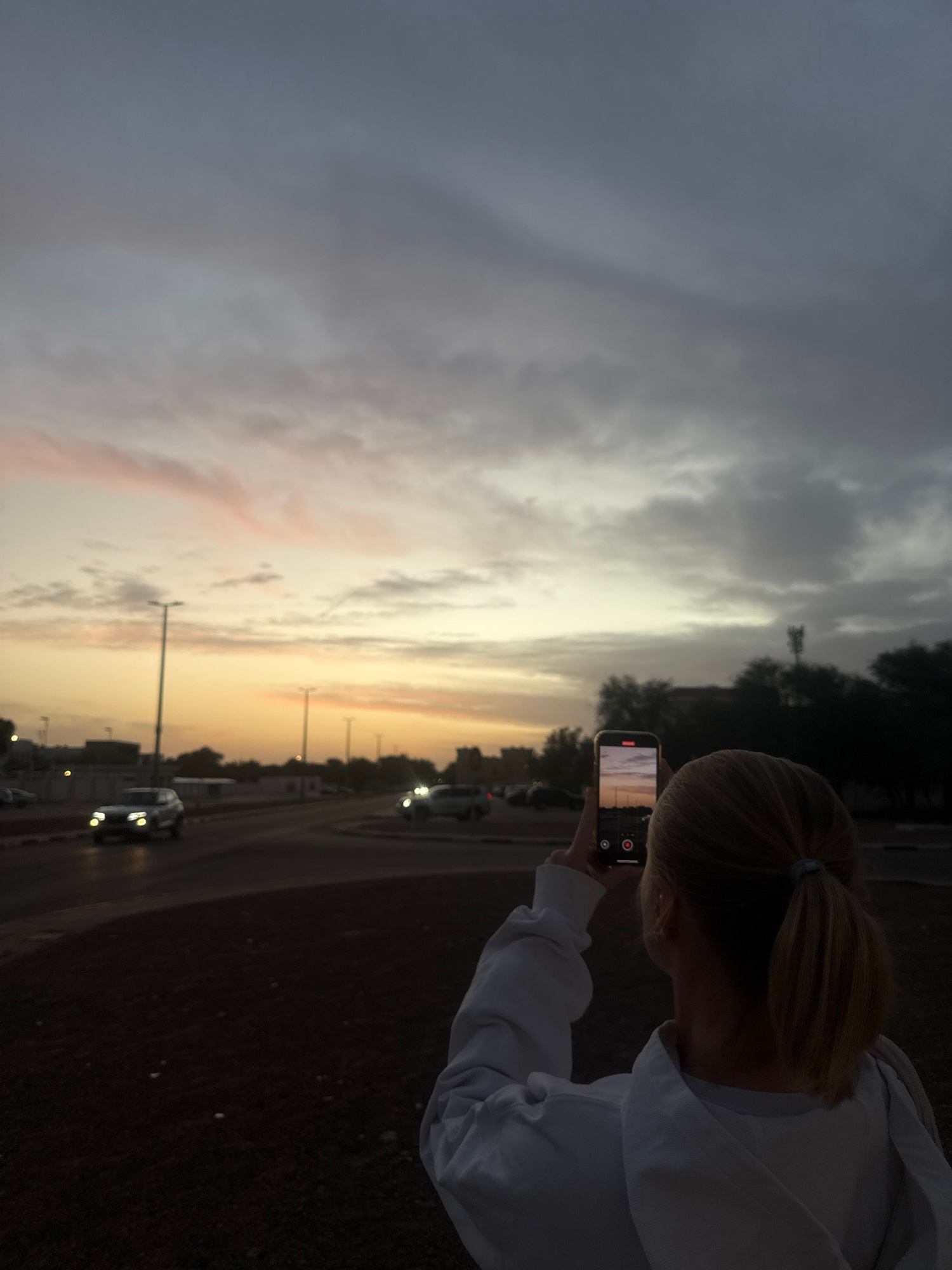 A person is holding a cell phone in their right hand, apparently recording a video of a sunset in Al Jimi, United Arab Emirates. The sky is a mix of grey and orange clouds, transitioning into a darken…read more