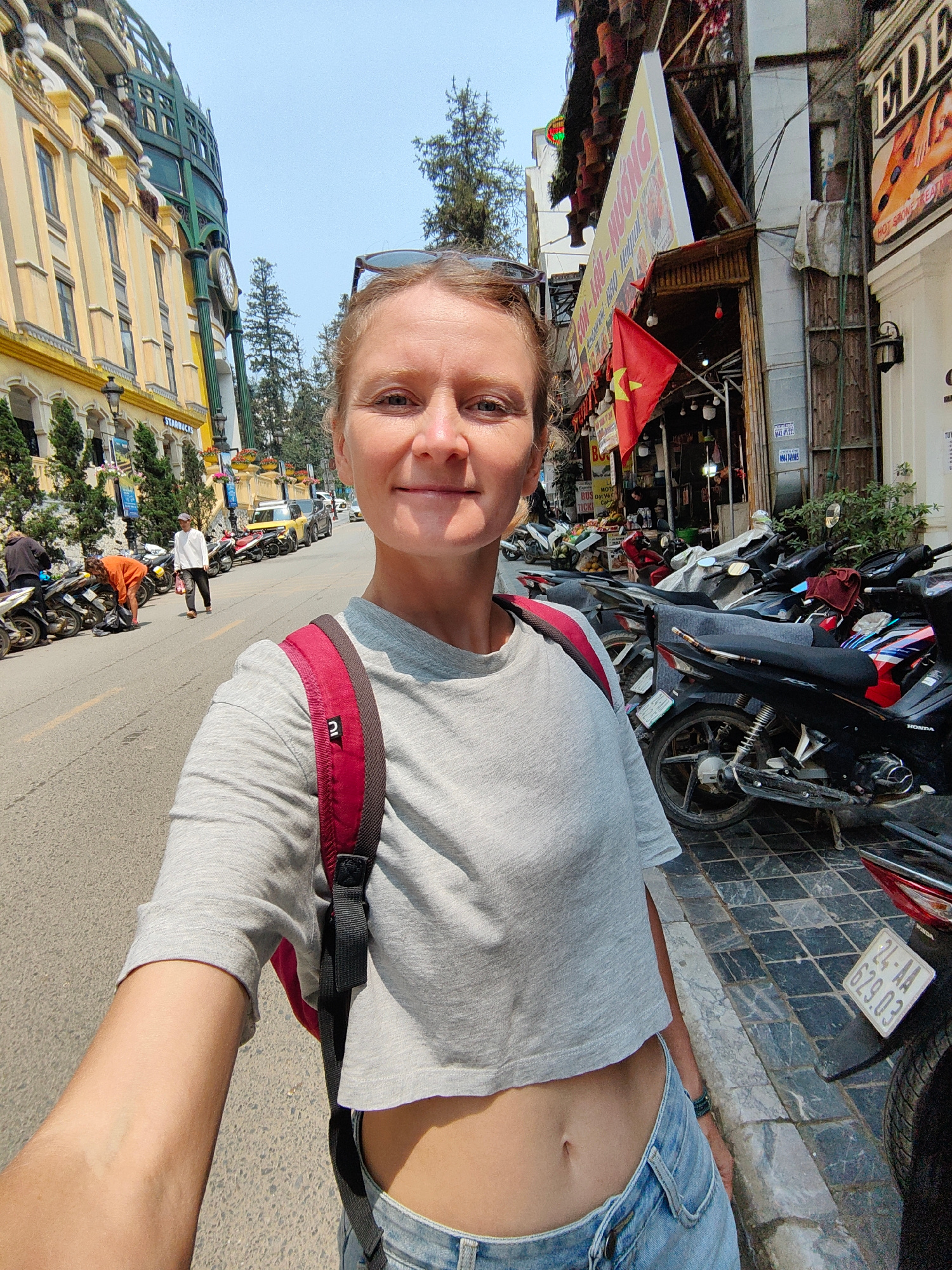 A fair-skinned woman with light brown hair pulled back, wearing sunglasses atop her head, is captured in a front-facing selfie on a sunny day. She wears a grey cropped t-shirt, light blue jeans, and a…read more