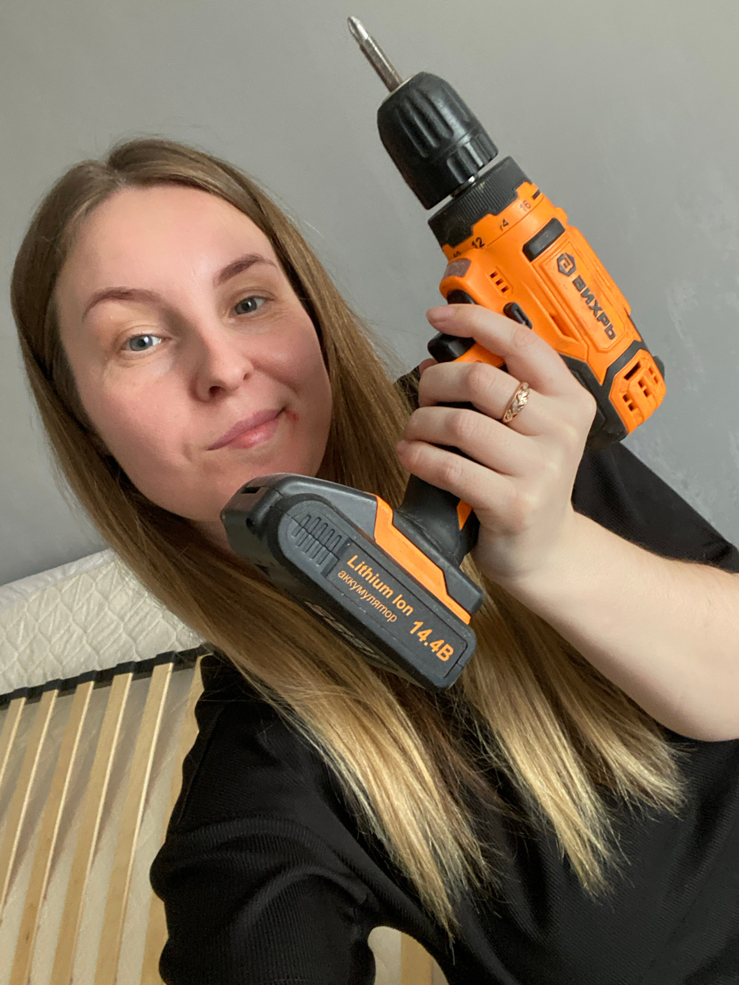 A woman with blonde hair is holding an orange and black power drill. The drill has a battery pack labeled "Lithium Ion 14.4B". The woman is wearing a black shirt and a ring on her finger. The backgrou…read more