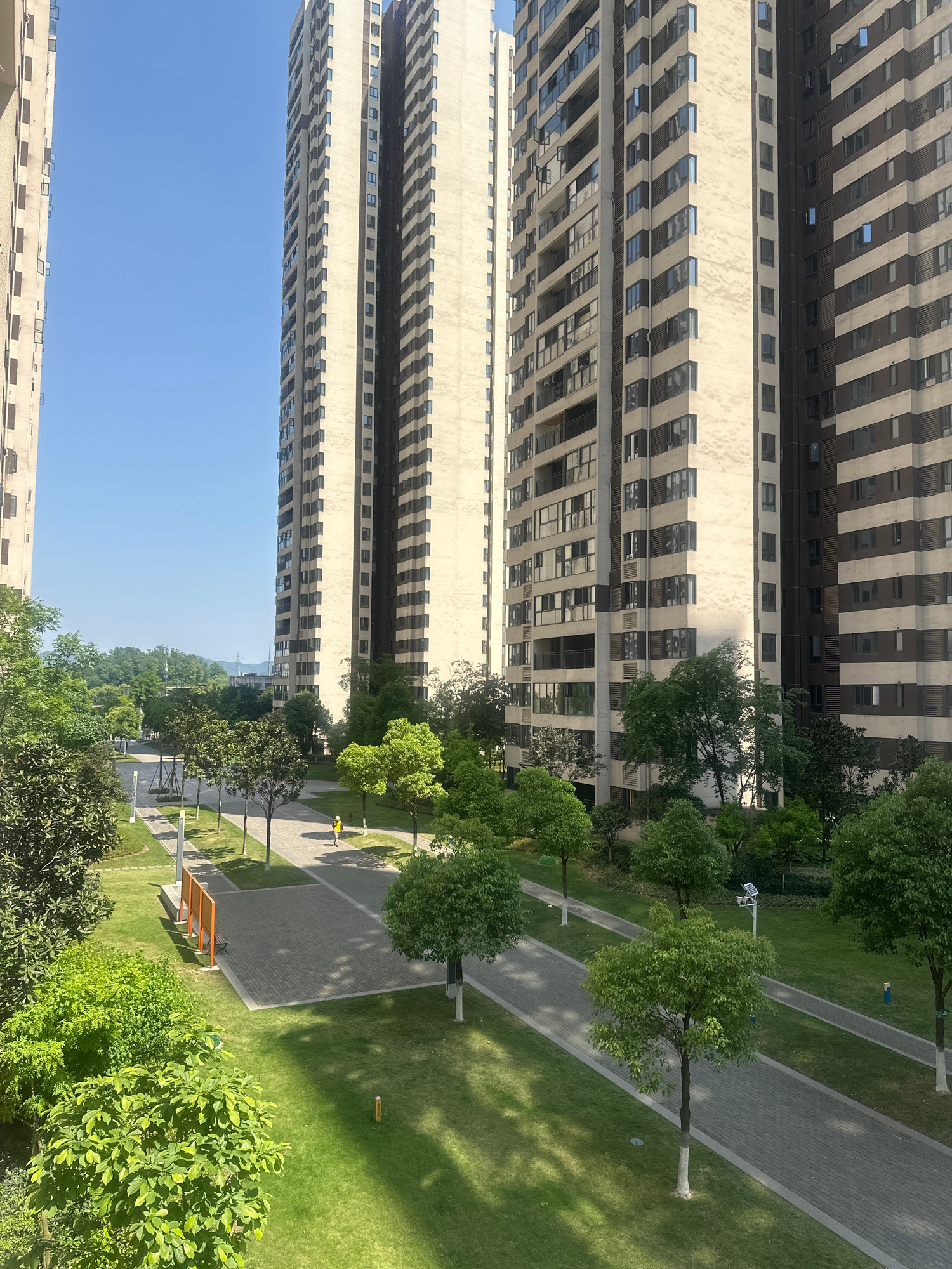 The image shows a view in the Chongqing High-tech Zone, China. Tall buildings with a repetitive pattern of windows dominate the left side of the image. A paved walkway bordered by trees and green spac…read more