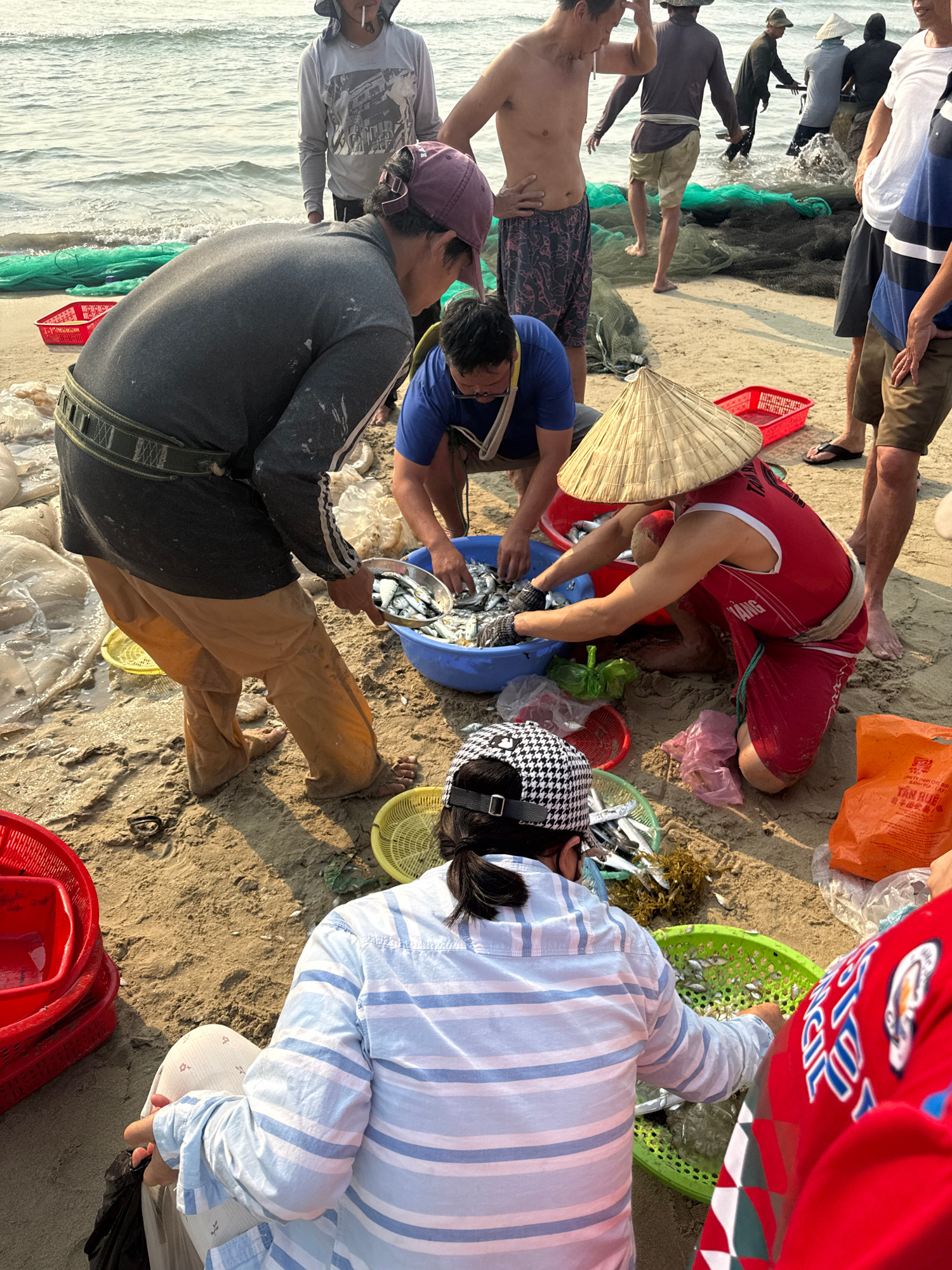 Several people are gathered on a sandy beach, possibly in Đà Nẵng, Vietnam. They are sorting fish, transferring them from a blue bucket into various containers, including green and red baskets. Some i…read more