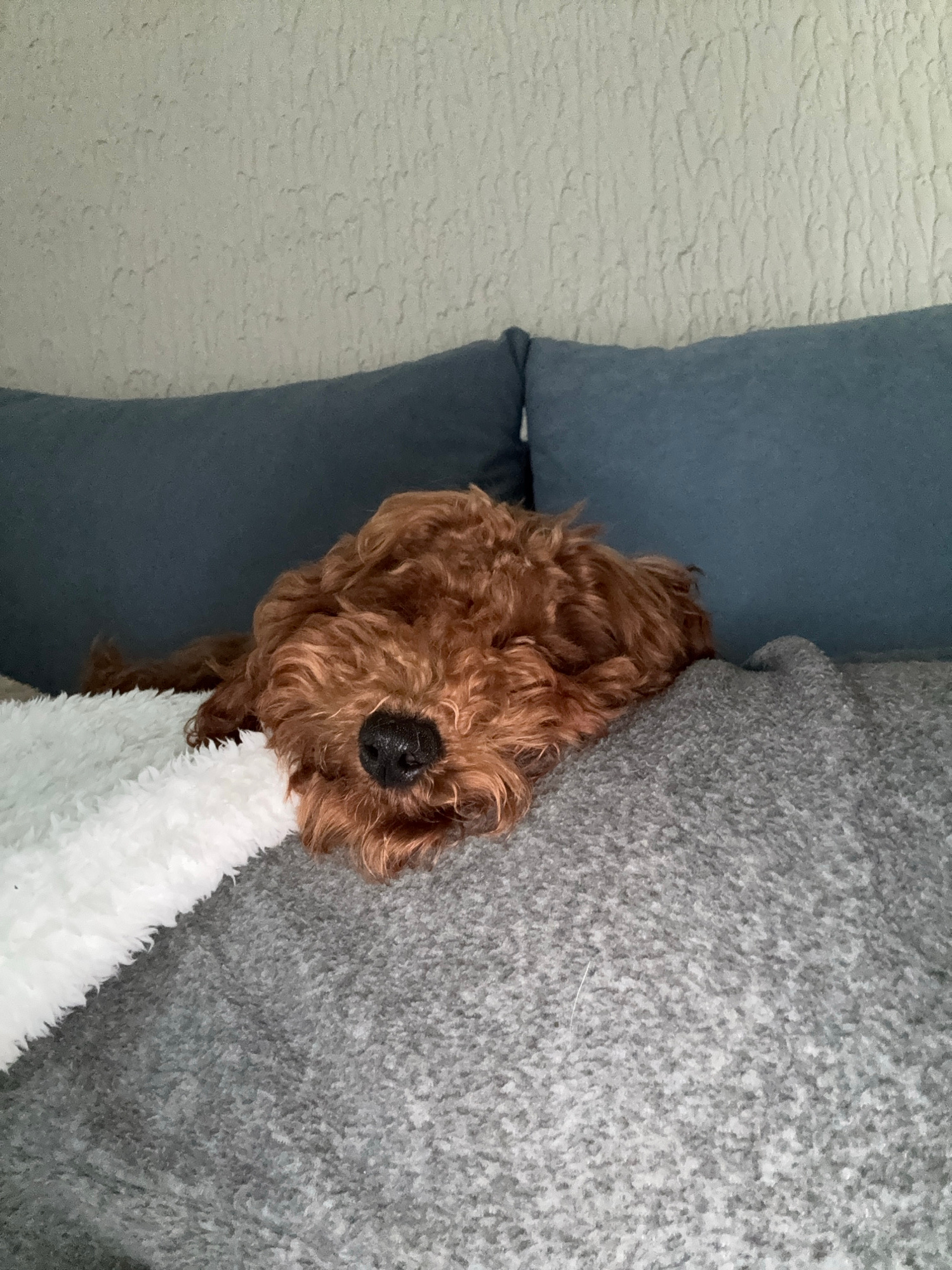 A reddish-brown, curly-haired dog is observed lying asleep on a grey textured blanket. A section of a white fluffy blanket is visible to the dog's left. The dog's black nose is prominent, and its eyes…read more