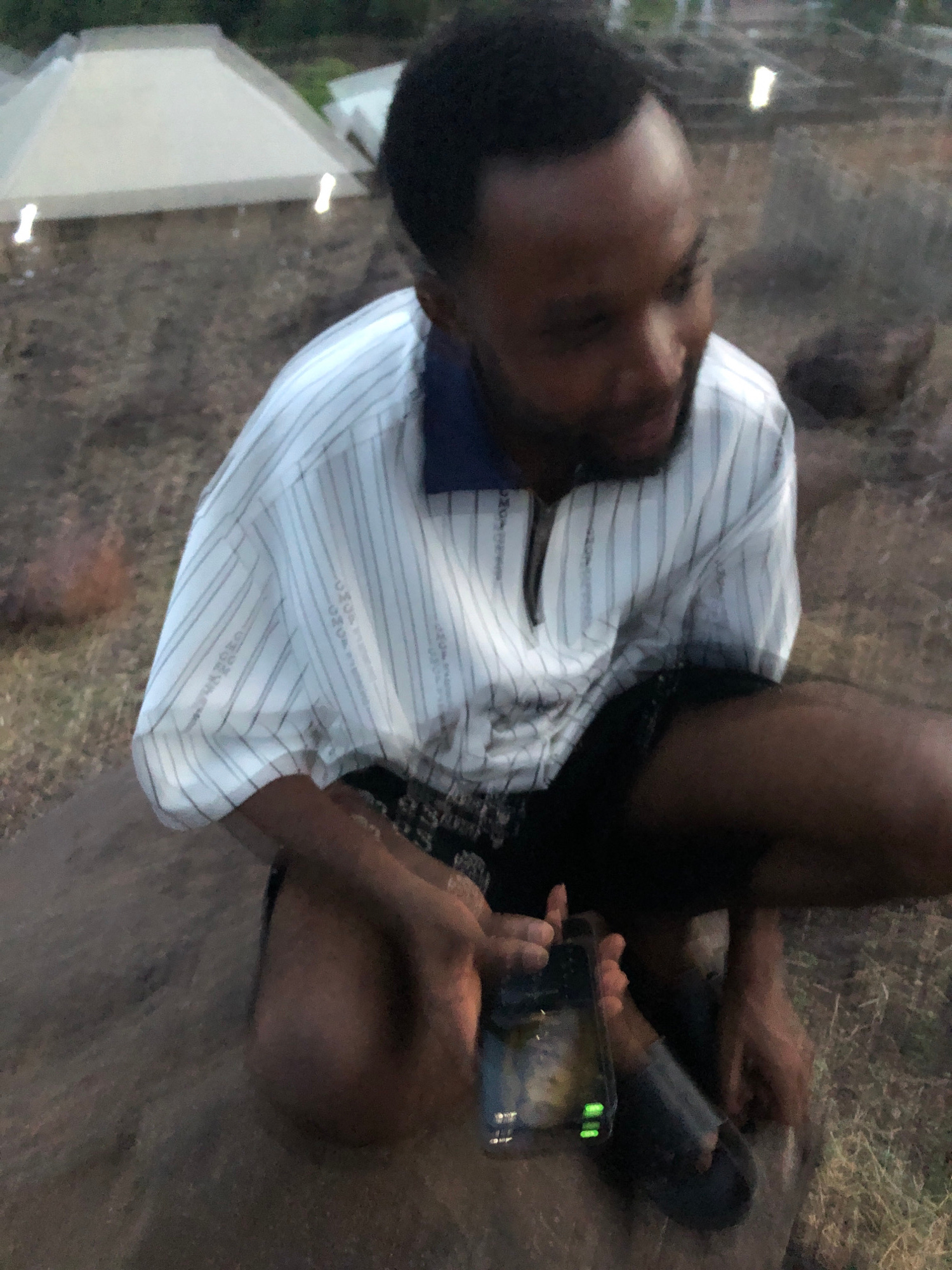 The image, rotated clockwise, depicts an adult male sitting on the ground outdoors, likely in Lokoja, Nigeria, during the evening or night. The man has a dark complexion, short dark hair, and a visibl…read more