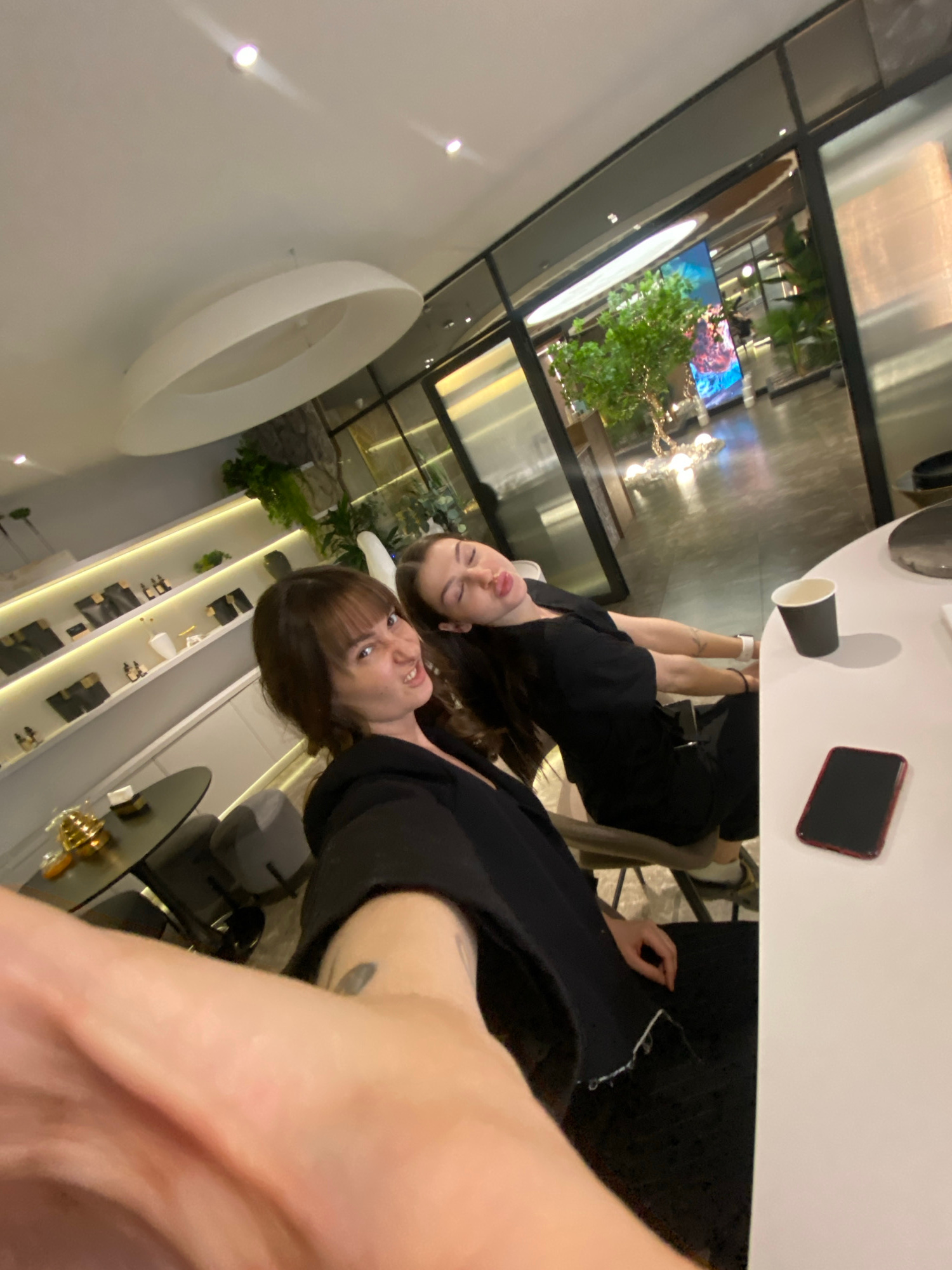 A selfie taken in a modern interior setting. Two people, likely female, are visible at a table. Both individuals are wearing black clothing. On the table are a black cup and a red smartphone. The room…read more