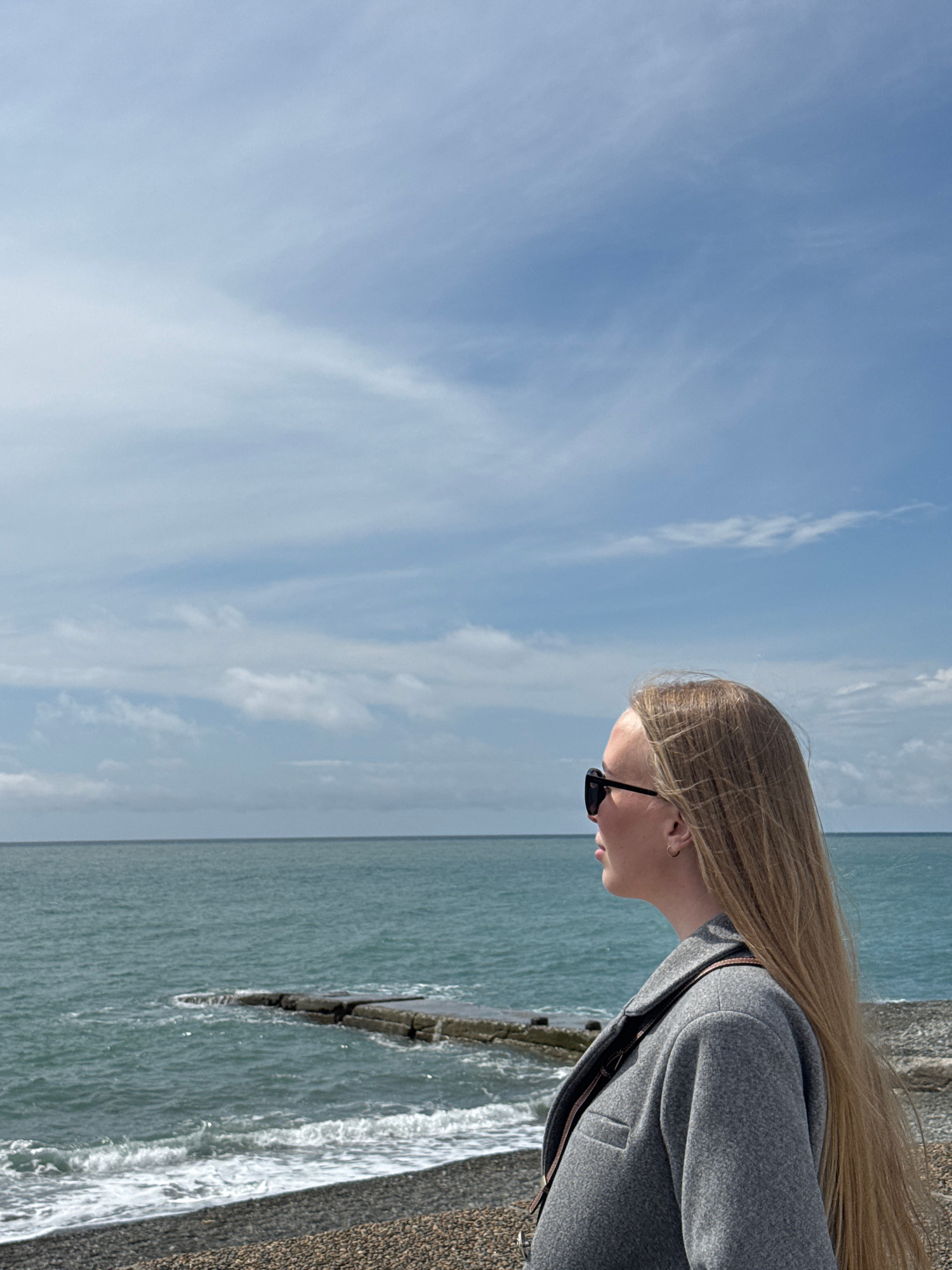 A woman with long blonde hair and sunglasses is standing on a pebble beach, looking down at the sea. She is wearing a gray coat and has a bag slung over her shoulder. The sea is visible in the backgroβ¦read more