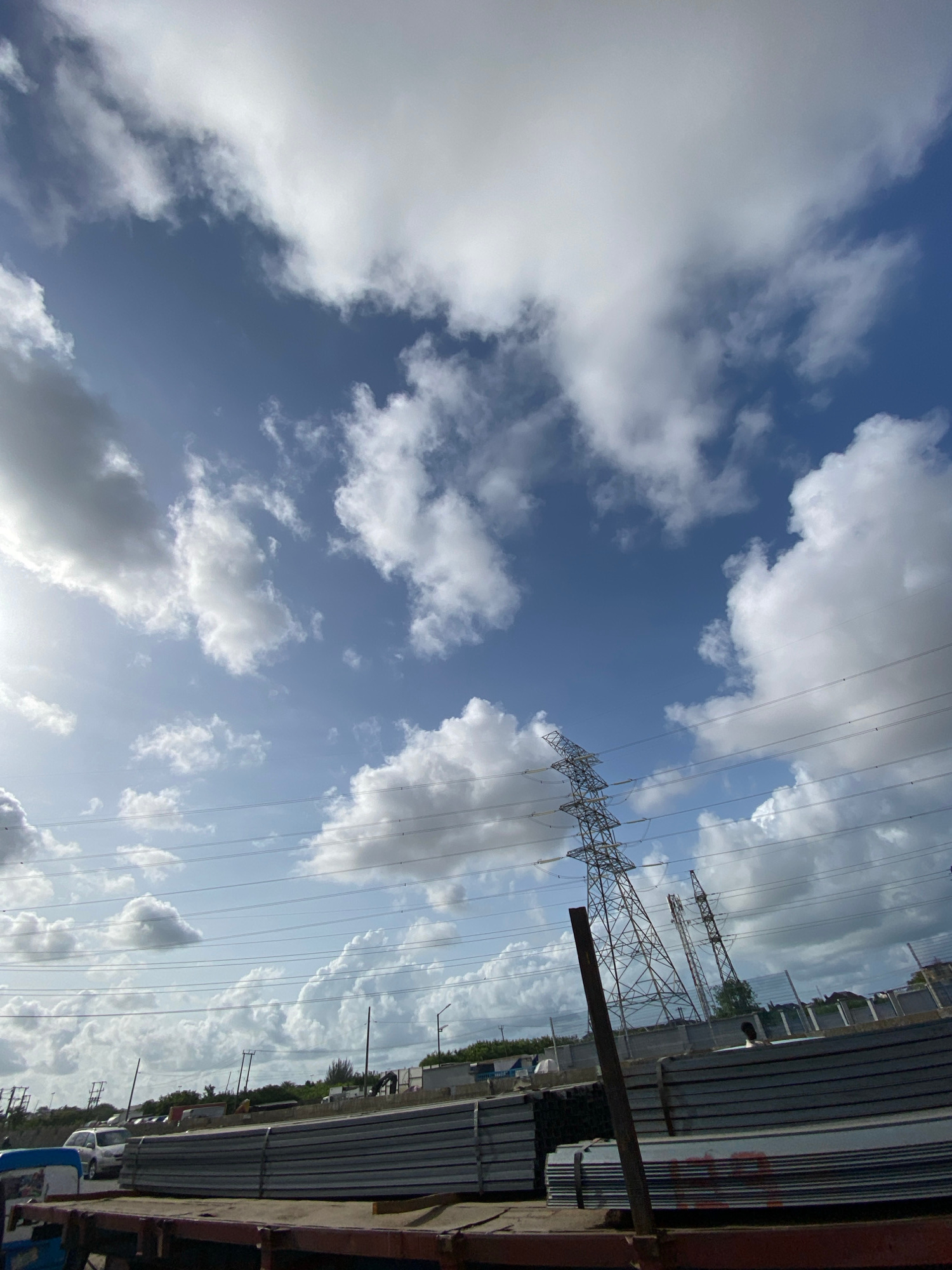 The image shows a view in Lekki, Nigeria, under a sky with scattered white and gray clouds and visible blue sky. Electrical power lines and support structures stretch across the frame, and stacks of lā¦read more