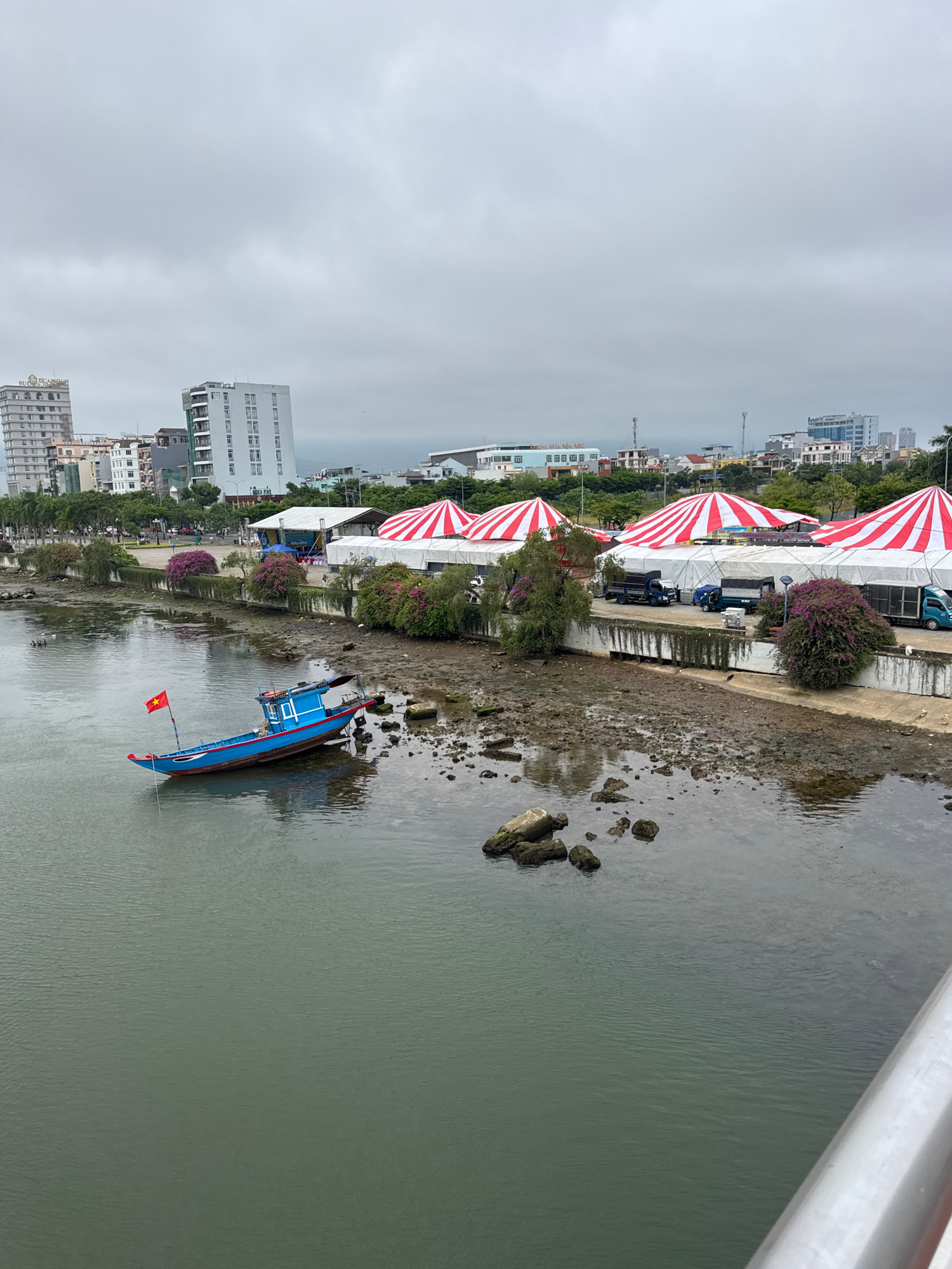 The image is taken from an elevated position, likely a bridge, overlooking a riverbank in Đà Nẵng, Vietnam. The sky is overcast. Along the riverbank, several large white tents with red and white stri…read more