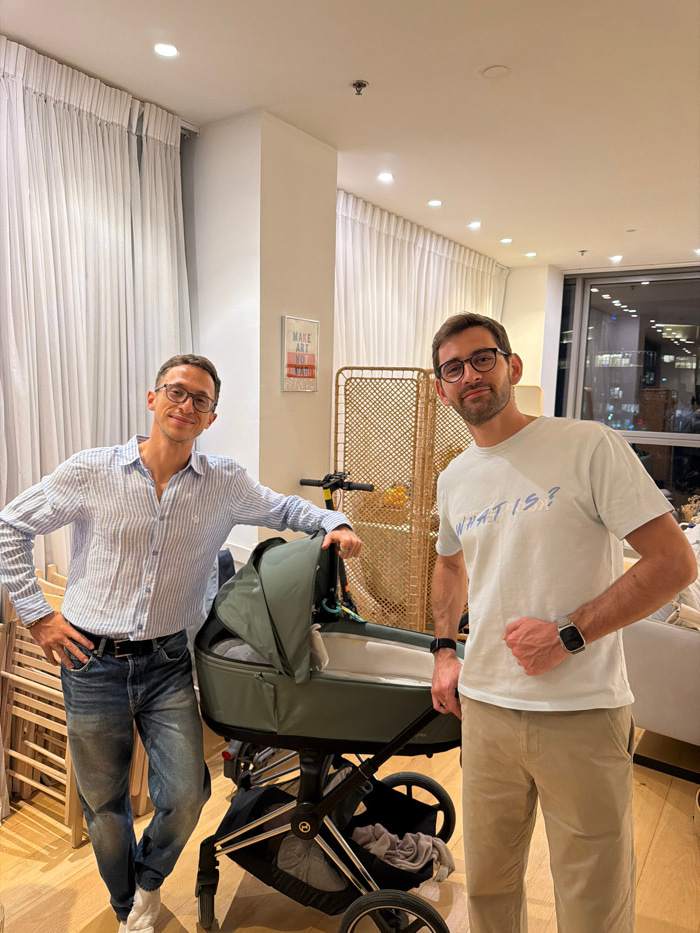 Two men wearing glasses pose in a modern living room. One wears a white t-shirt and beige pants, while the other wears a blue striped shirt and jeans. A baby stroller is between them. The room featureβ¦read more