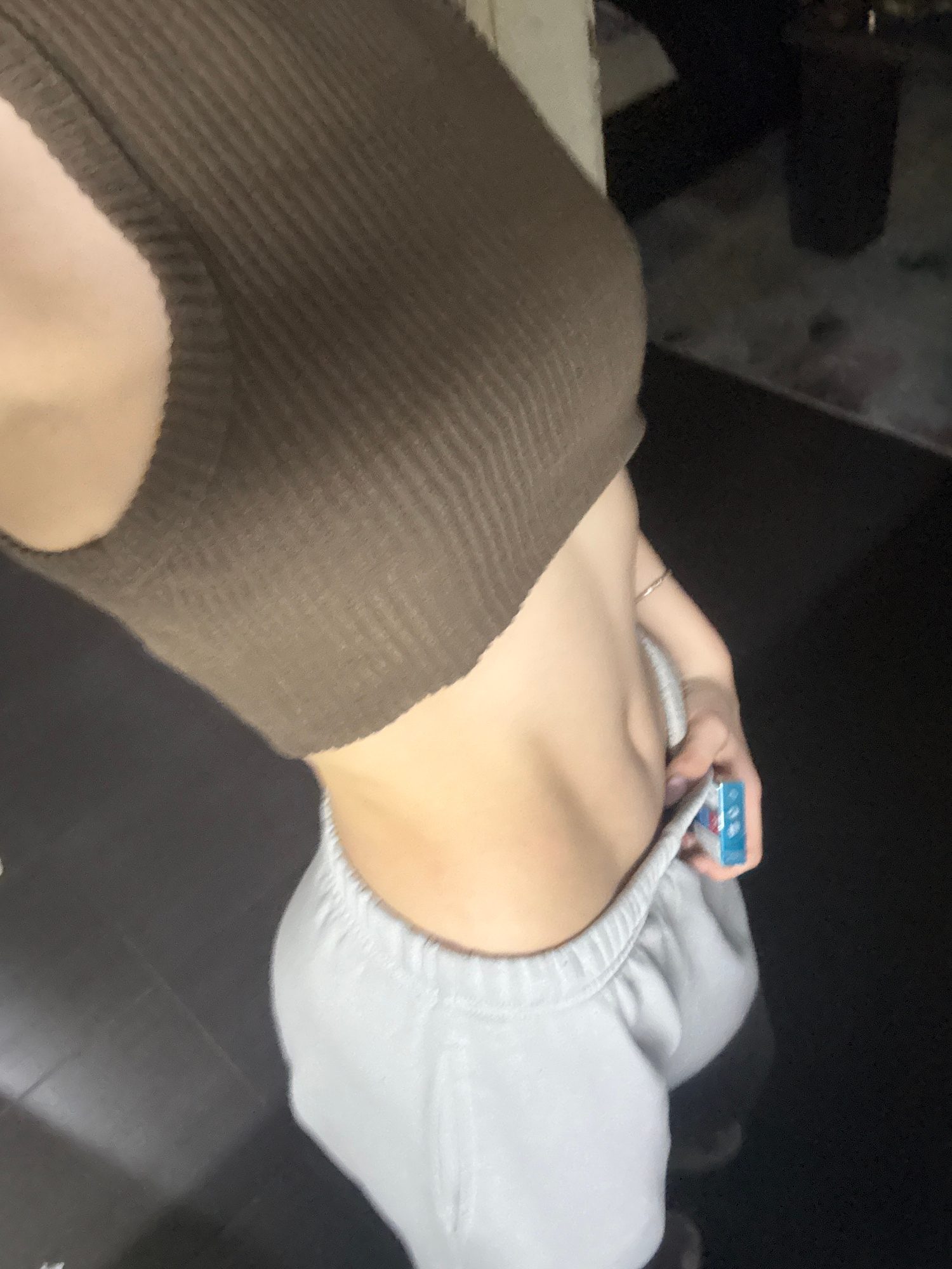 A person wearing a brown ribbed top and a grey hoodie is lying on a dark surface. The person is holding a small blue and white box. The setting appears to be indoors. It is not possible to determine t…read more