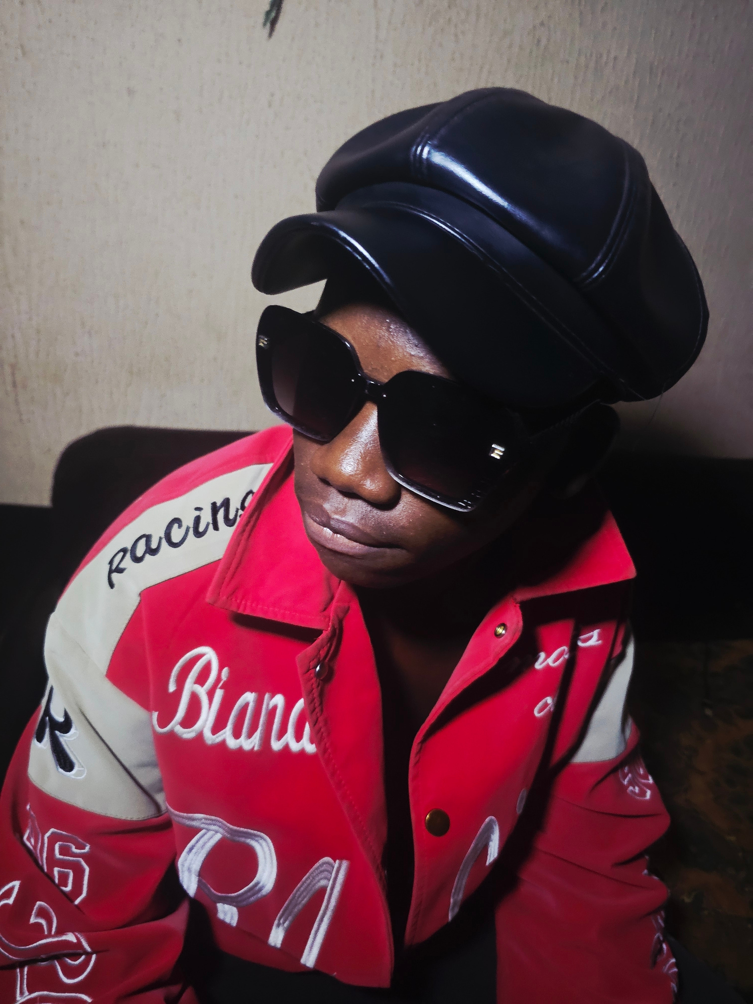 A person with dark skin wears a black leather hat and dark sunglasses, viewed from a low angle in Nkwelle, Nigeria. They are wearing a red and white racing jacket with "Bianca" and "Racing" written on…read more