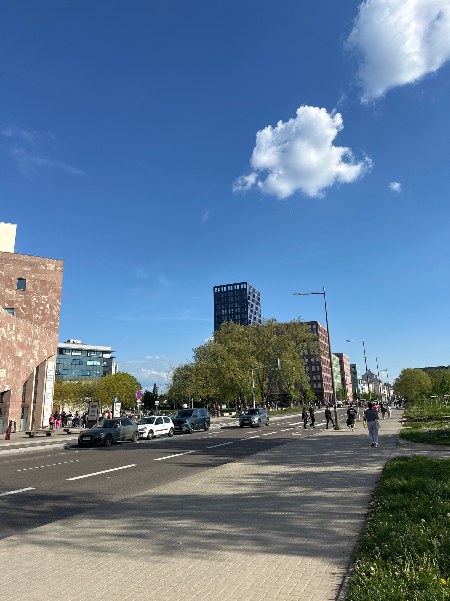 The image shows a street scene in Strasbourg, France, characterized by modern architecture, vehicular traffic, and pedestrian activity under a bright blue sky with a prominent white cloud. Buildings:…read more
