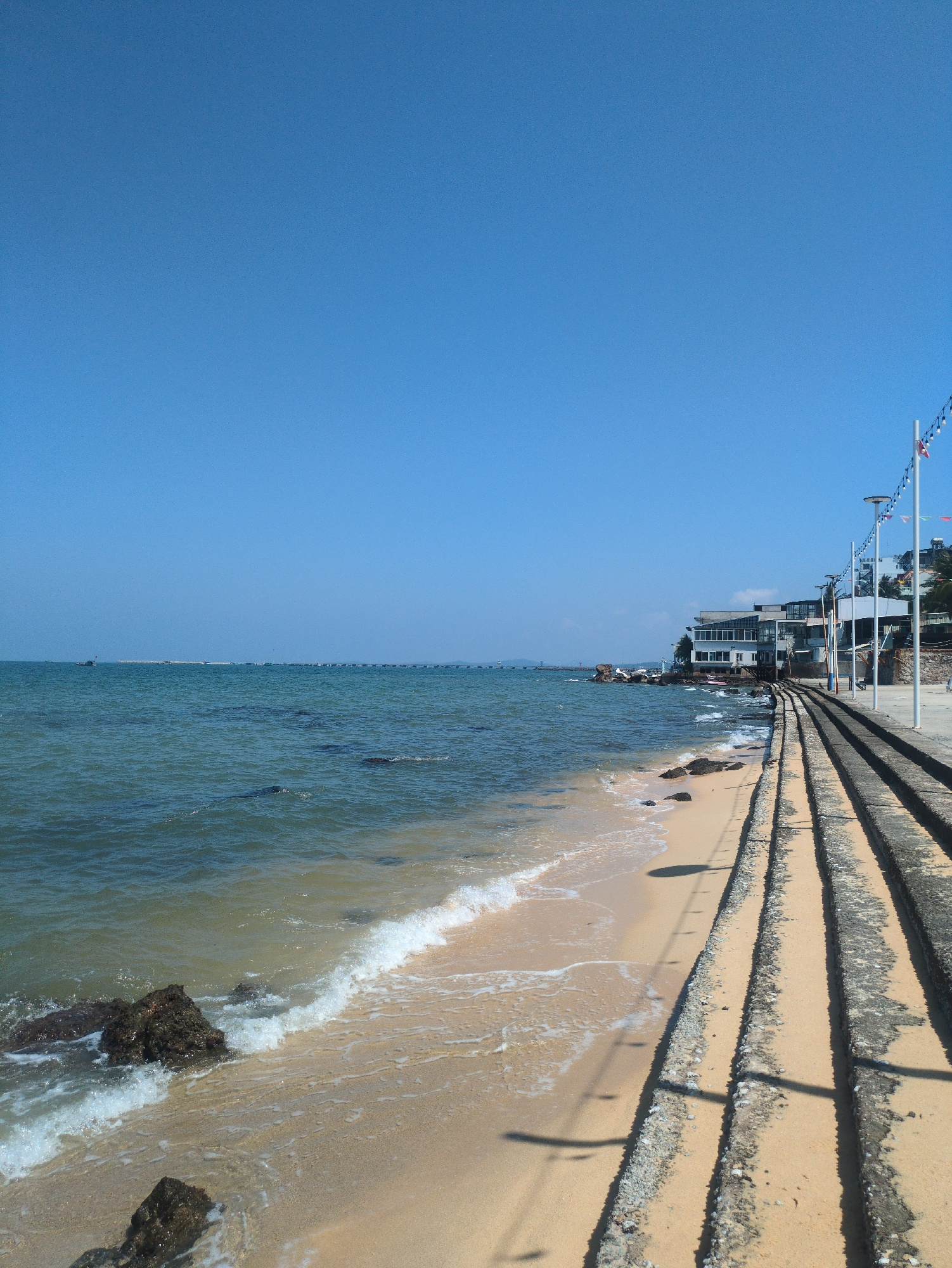 The image shows a beach scene in Phú Quốc, Vietnam, photographed on a bright, sunny day. The perspective is a horizontal orientation, with a split view of the sky and the coast. The clear, light blue…read more