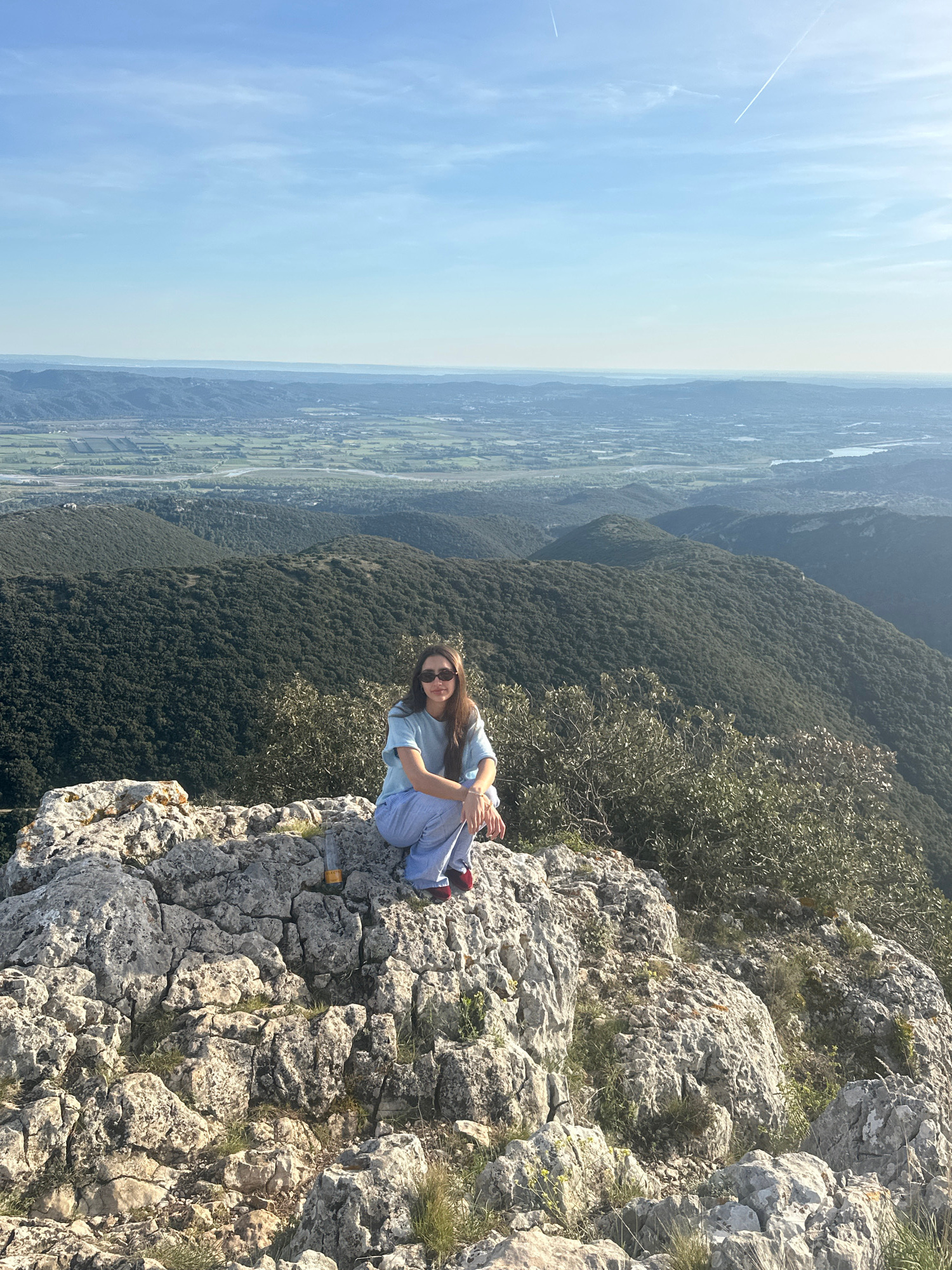 A woman sits on a rocky cliff edge, gazing towards the camera, with a vast panoramic vista stretching out behind her. She wears a light blue shirt, light-colored pants, sunglasses, and red shoes. The…read more