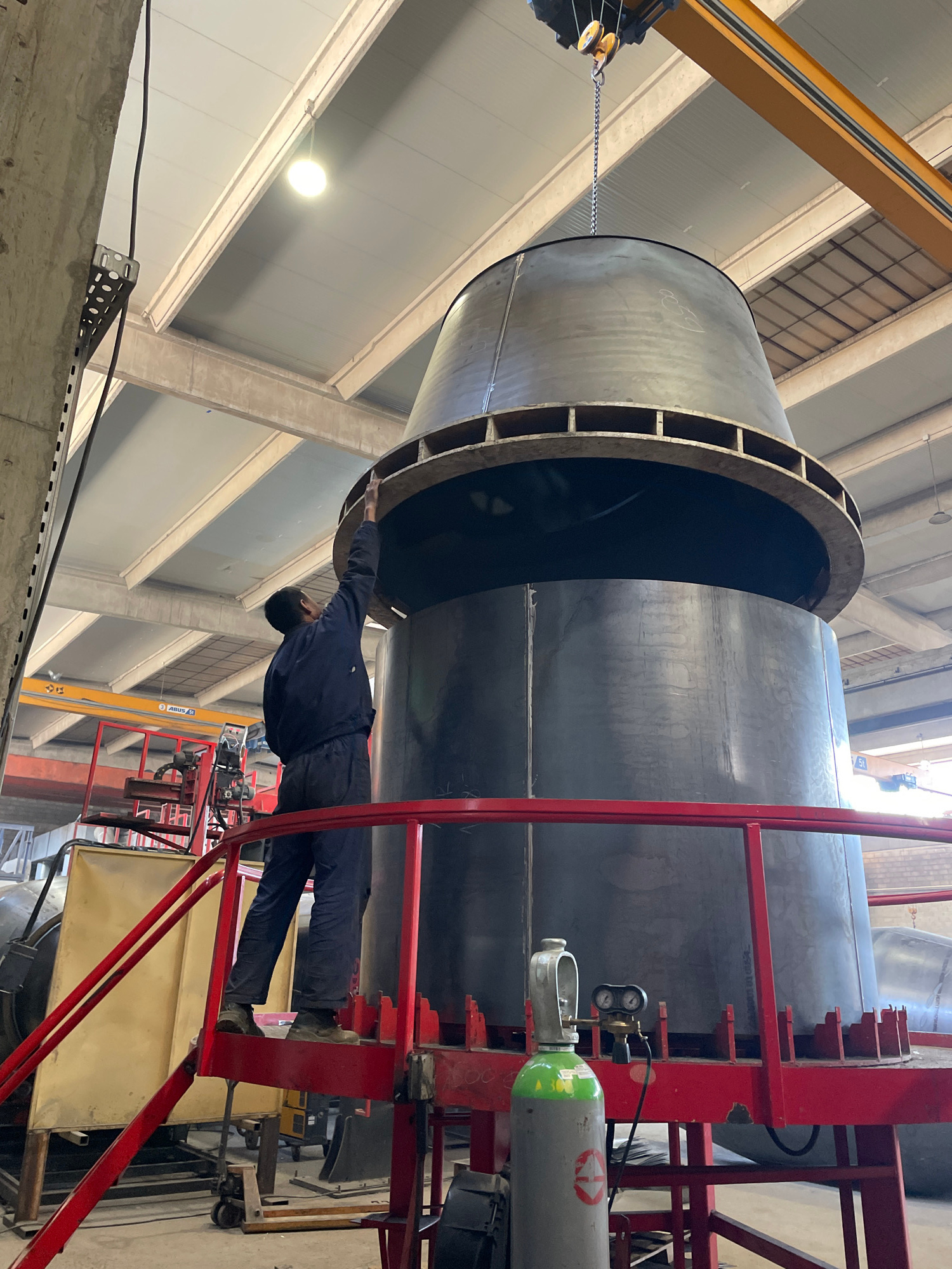 An individual wearing dark clothing is positioned between a large metal cylinder suspended by a yellow crane and a red metal frame or scaffold. The cylinder has a flared end with internal structures.…read more