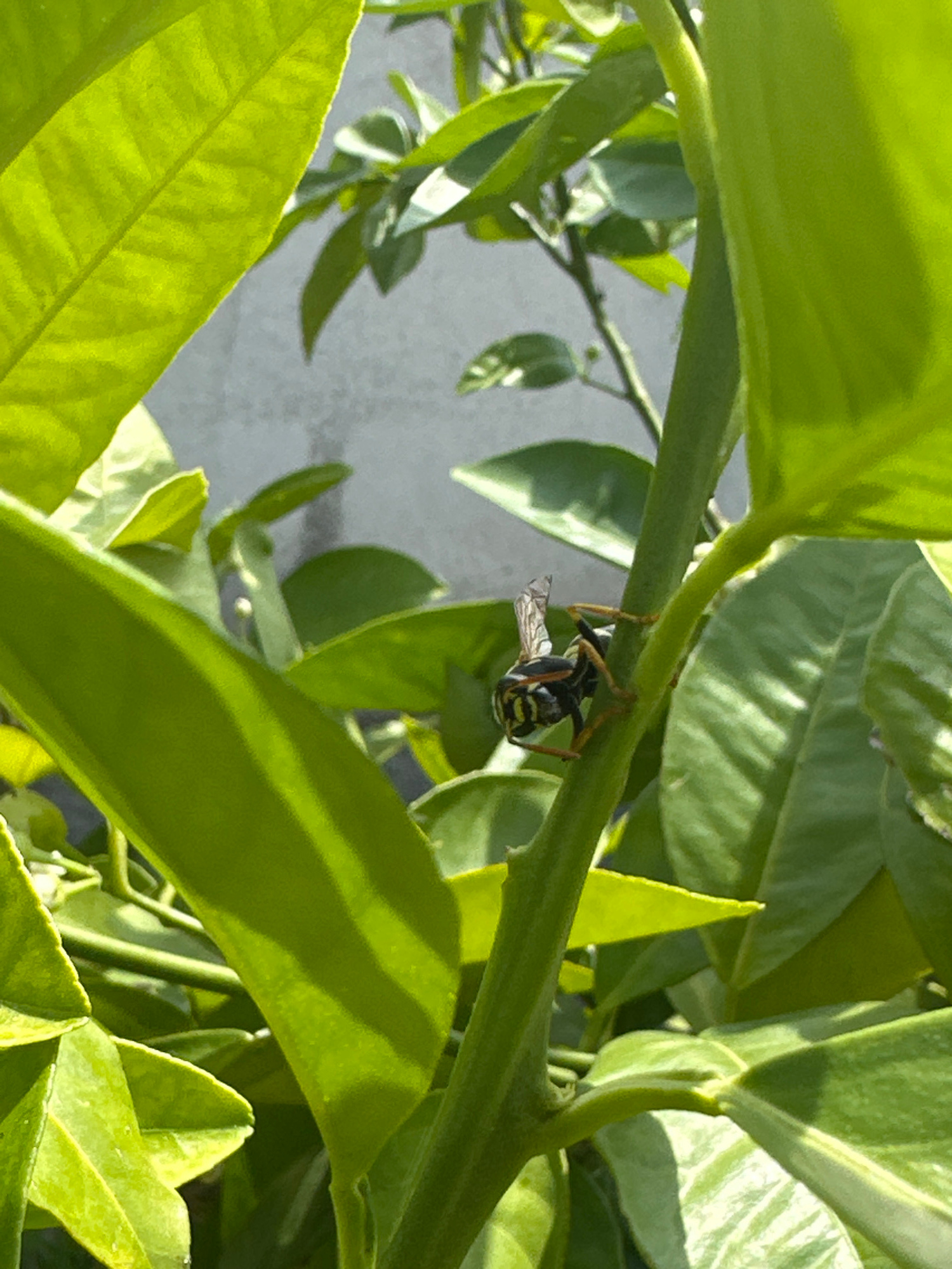 A wasp hangs upside down from a green plant stem. The wasp has a black and yellow striped abdomen and translucent wings. The surrounding foliage is bright green and lush. A grey surface is visible inβ¦read more