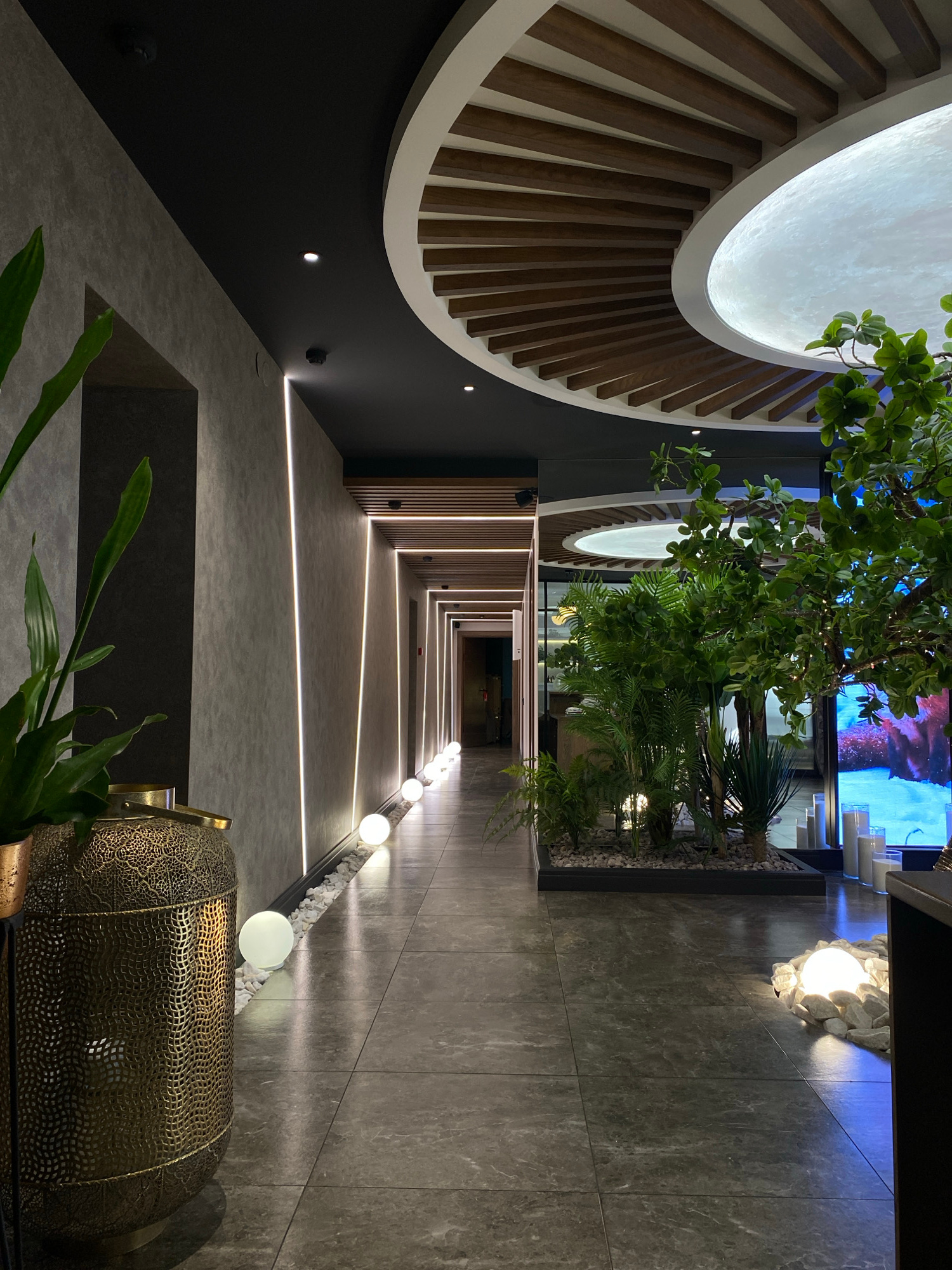 The image depicts a hallway interior. A large, illuminated circular design element is on the left of the ceiling. A line of foliage extends along the hallway. Linear lights extend down the hallway, le…read more